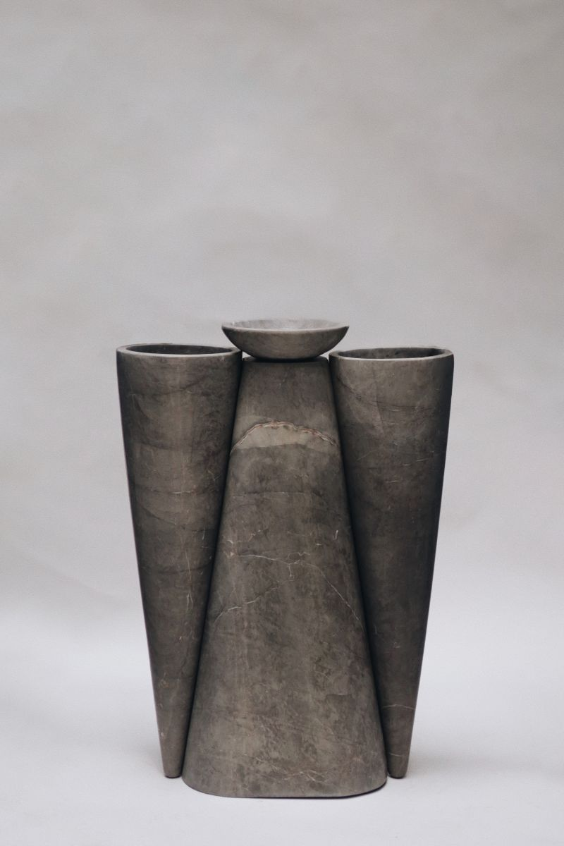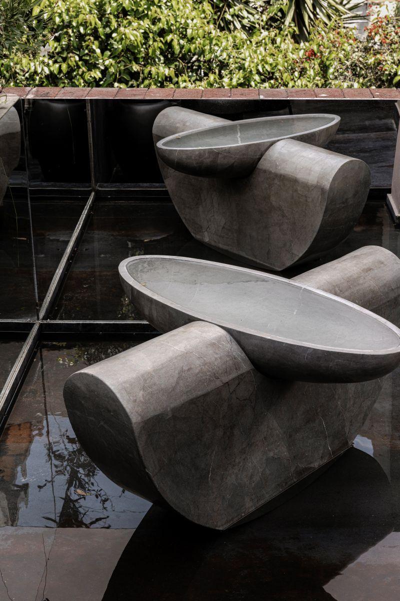Geometria sa — inspirată din ornamentele ancestrale — se curbează după fluxul lichidului, ca o ofrandă cu sens profund și intim. TLAL, o fântână construită din volume intersectate, explorează contrastul dintre greutate și fluiditate, invocând forța ploii ca simbol al renașterii.