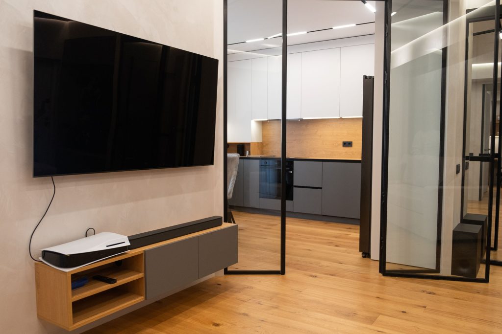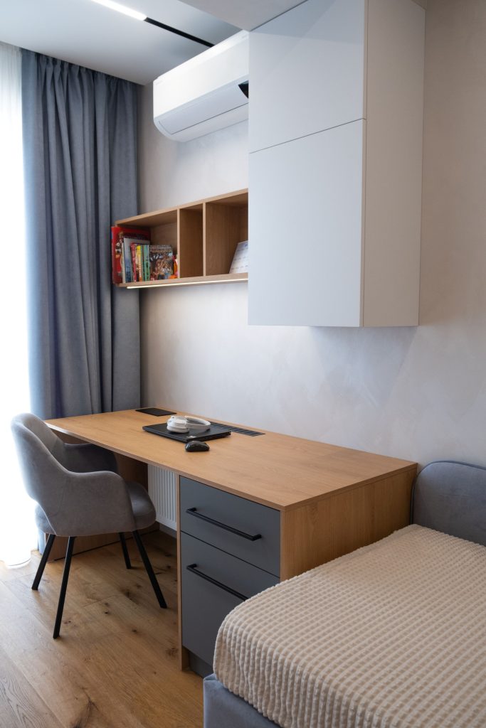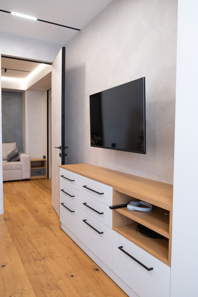 Mobilierul media suspendat, care păstrează combinația lemn–gri, contribuie la un aspect aerisit și ordonat.