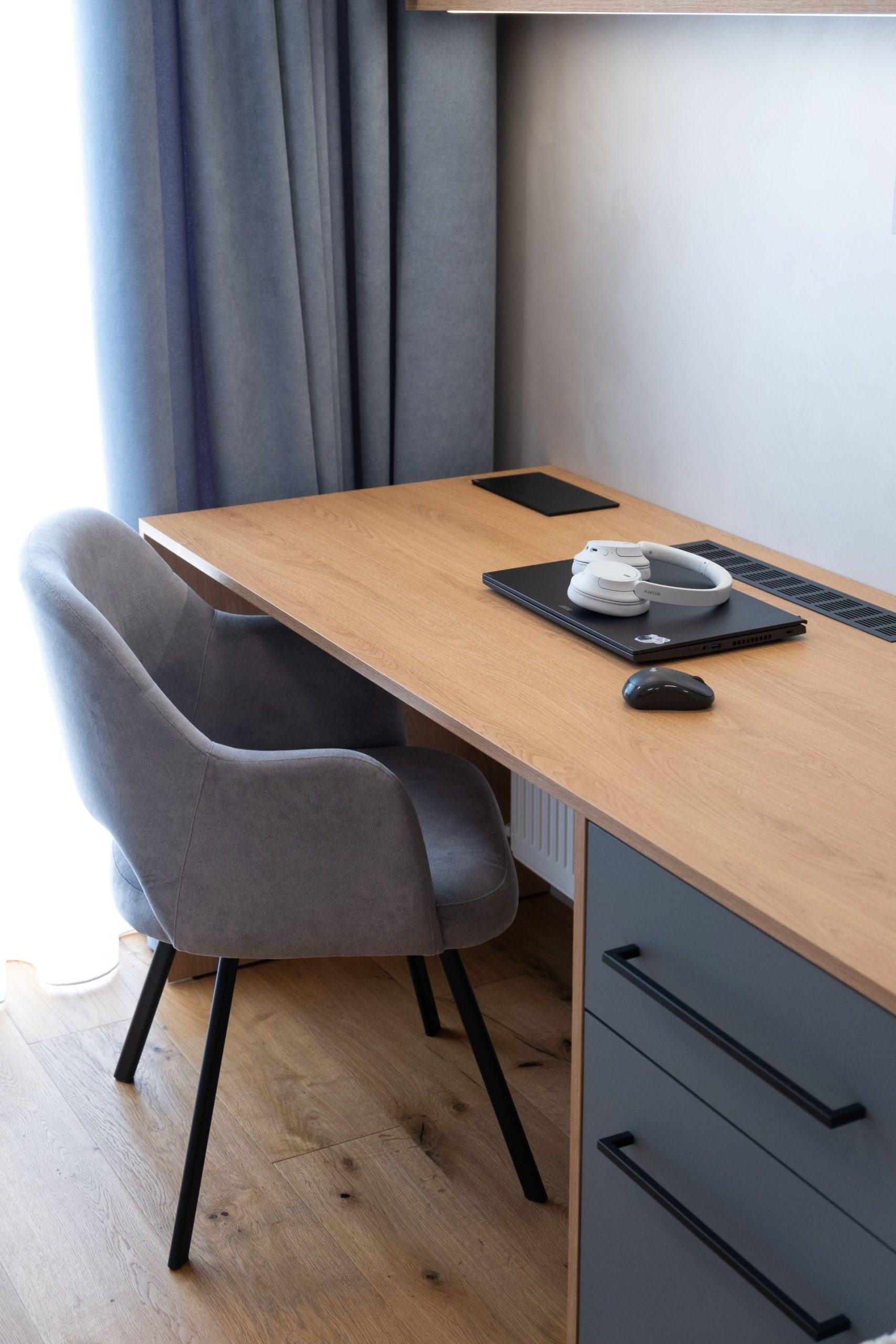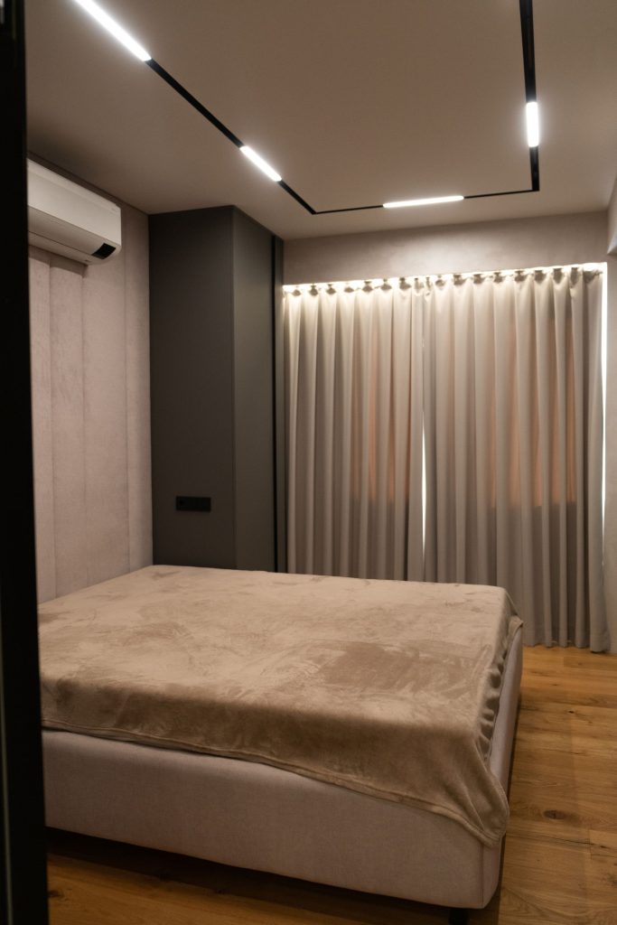 Draperiile în tonuri greige și finisajele mate creează o notă de intimitate, iar mobilierul minimalist conferă funcționalitate și eleganță.