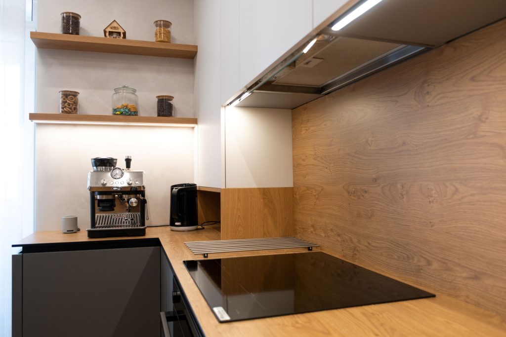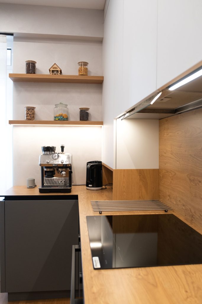 Spațiul cuprinde trei dormitoare, un mini birou, living, bucătărie, două băi și un dressing. Bucătăria este zona principală, cu mobilier în linii minimaliste și tonuri mate de gri, puse în valoare prin textura caldă a lemnului natural. Brâul decorativ din același material creează continuitate vizuală, iar accentele negre adaugă un contrast elegant, specific stilului industrial.