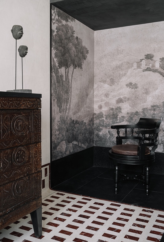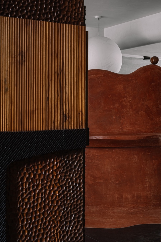 Ușa de intrare din lemn gravat, inspirată din Bauhaus, contrastează cu atmosfera dramatică din spațiul interior.
