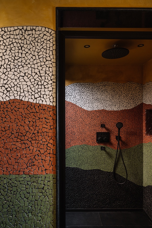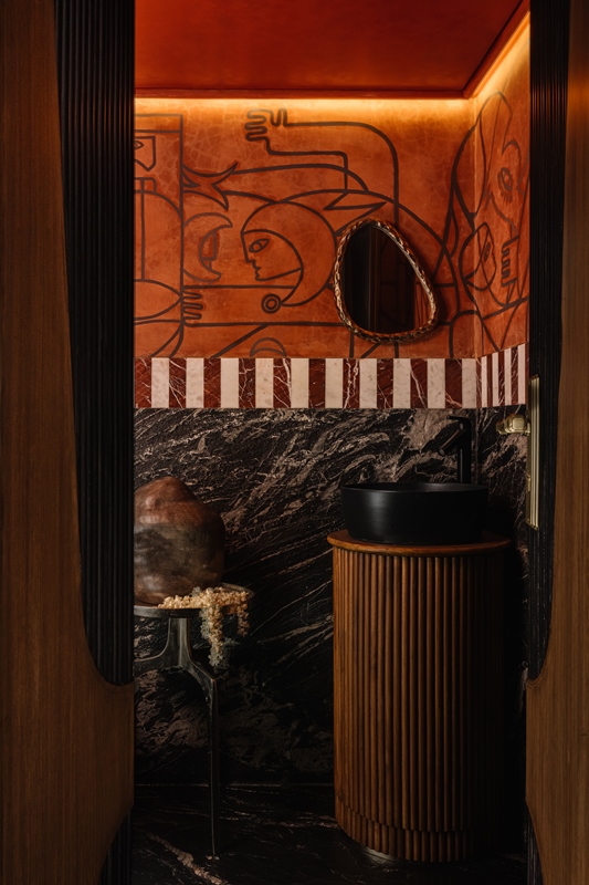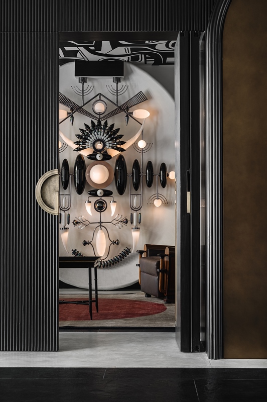 Sufrageria, care se ascunde în spatele acestui perete, cuprinde o masă monolitică din marmură africană luminată de „Lumina Lunii” a lui David Groppi.