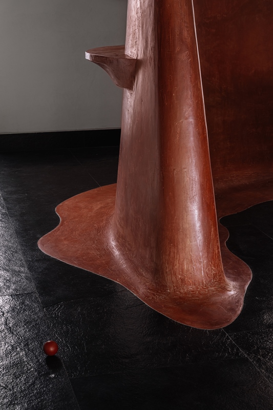Imediat după intrare, un perete sculptural din teracotă roșie, denumit „Lumânarea care se topește”, se „prelinge” senzual pe podea, făcând aluzie la celelalte spații de locuit.