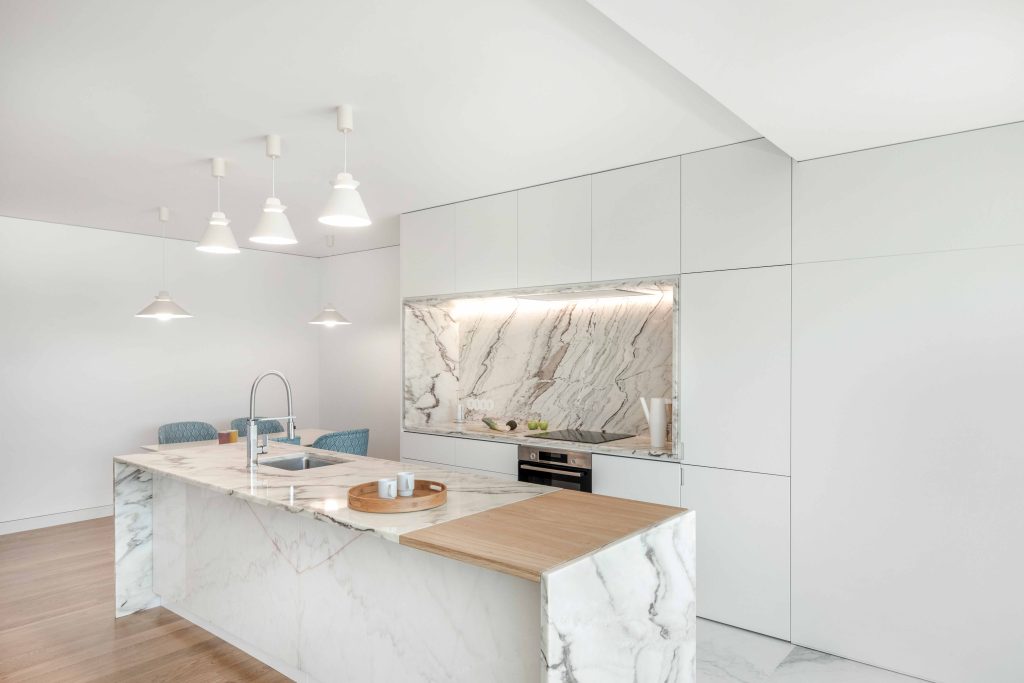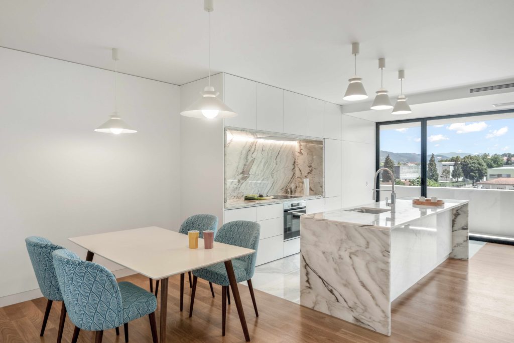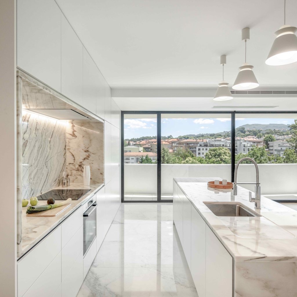 Materialele folosite – lemn autohton (stejar, castan) și marmură din Estremoz – adaugă o notă de autenticitate și durabilitate, în timp ce geometriile clare ale spațiilor permit o mobilare eficientă și luminozitate maximă, fără a sacrifica intimitatea.