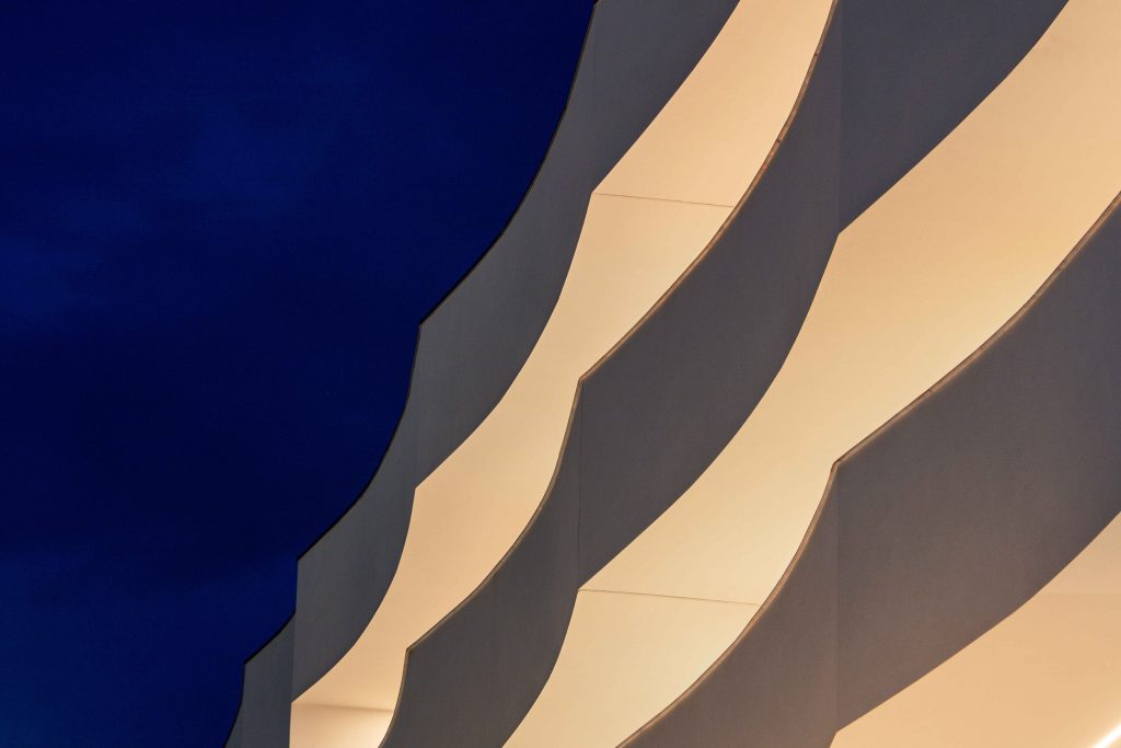 Jocul de lumini și umbre creează un fundal captivant al străzii, iar panourile verticale sparg liniile orizontale ale balcoanelor, oferind o compoziție vizuală ce își schimbă aspectul în funcție de momentul zilei.