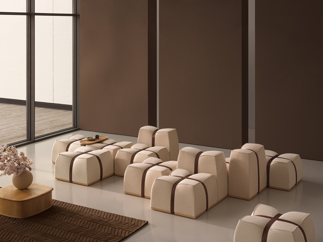 O măsuță mică este integrată în mobilier pentru a sublinia utilizarea multifuncțională, în timp ce husele detașabile și detaliile curelelor asigură întreținerea ușoară, dar și un caracter vizual deosebit.