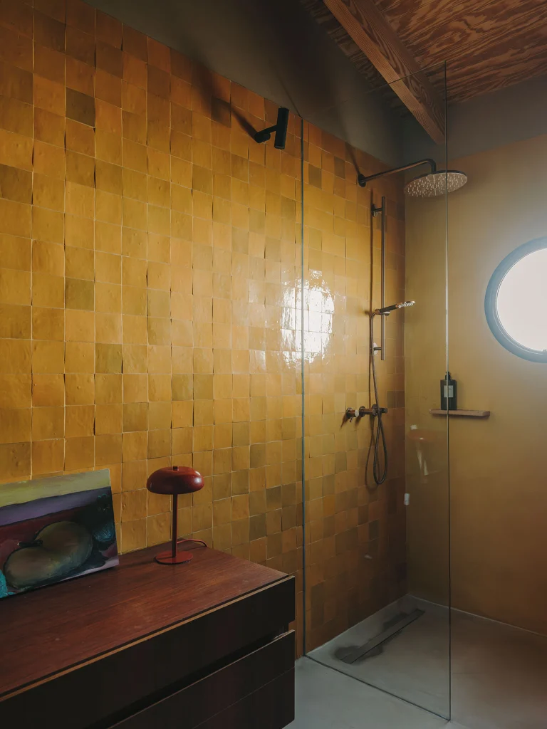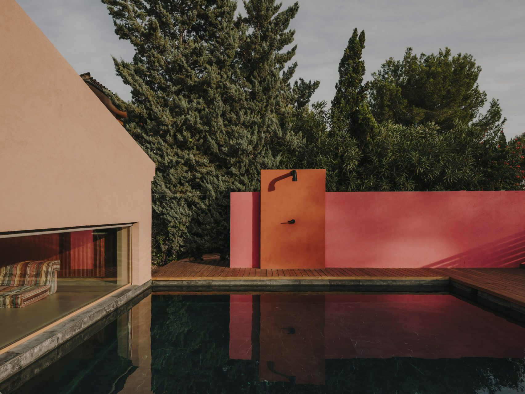 În zona piscinei, un perete mai înalt, de culoare portocalie arsă, creează o zonă deschisă de duș, astfel încât locuitorii să se poată clăti după înot.