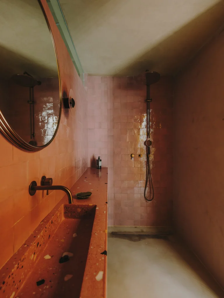 Băile prezintă plăci de ceramică spaniolă, tăiate manual, și chiuvete din terrazzo realizate de producătorul local „Huguet”.