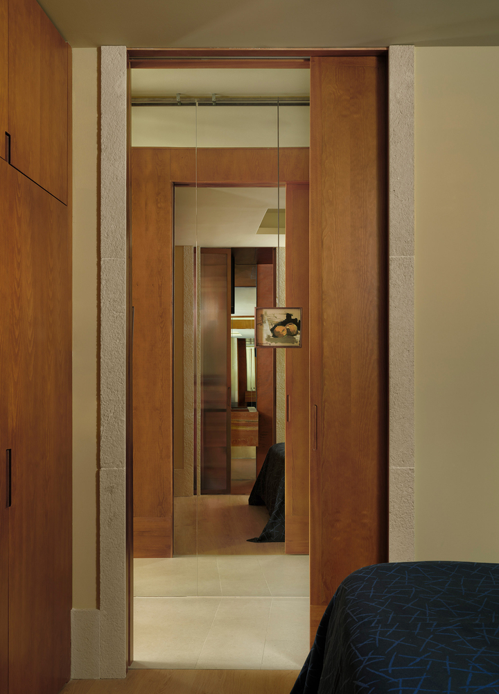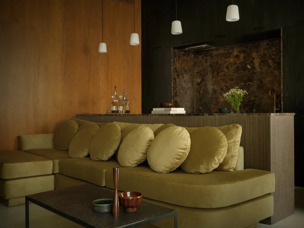 Bucătăria are aspectul unui volum din lemn închis la culoare integrat în spațiul principal de locuit, cu o deschidere centrală din marmură ce iese în evidență, dar menținând continuitatea vizuală. În interiorul „nucleului” de stejar, dormitorul și baia formează o zonă mai intimă, accesibilă printr-o ușă glisantă mare ce marchează tranziția dintre spații.