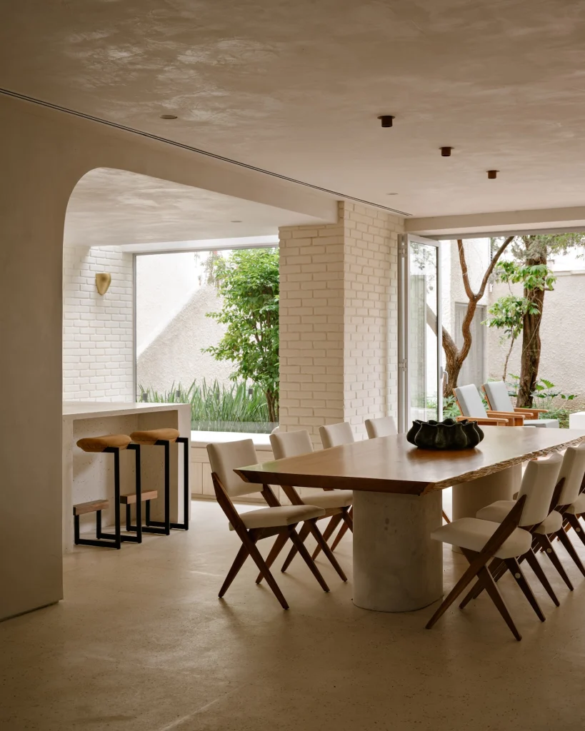 Construcția dialoghează cu mediul înconjurător urban prin cărămida vopsită în alb – o alegere materială ce face referire la moștenirea modernistă a orașului São Paulo, adăugând, în același timp, masă termică și profunzime texturală. Cărămida albă este folosită și în spațiile interioare, integrând designul locuinței în context. Detaliile din lemn apar selectiv: la ușa de la intrare, ferestrele fațadei, terasa din spate – creând o notă caldă compoziției de texturi, fără a perturba ierarhia materialelor.