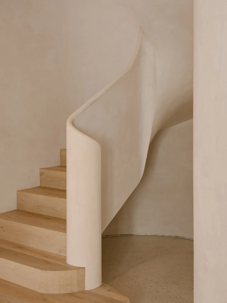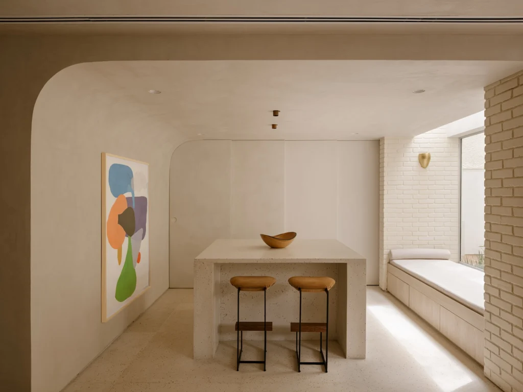 În interior, spațiile sociale de la parter sunt organizate fluid. Bucătăria nu este un spațiu izolat, ci oferă două zone deschise de gătit și de luat masa casual. Ferestrele mari inundă spațiile cu lumină naturală. Marginile curbate ale tavanului accentuează limbajul spațial continuu al casei.