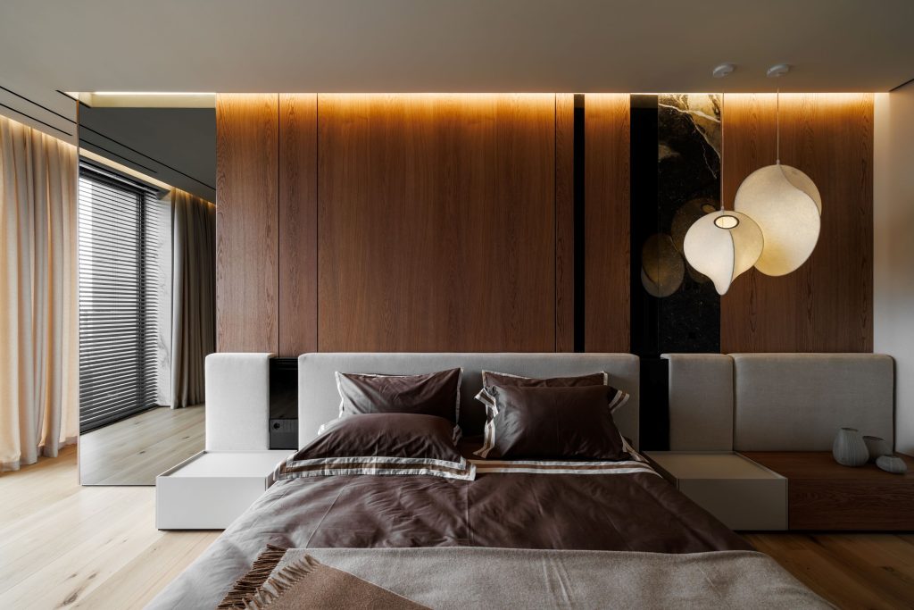 Dormitoarele „respiră” prin texturile textile naturale și finisajele rafinate.