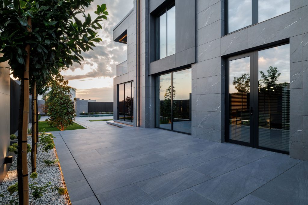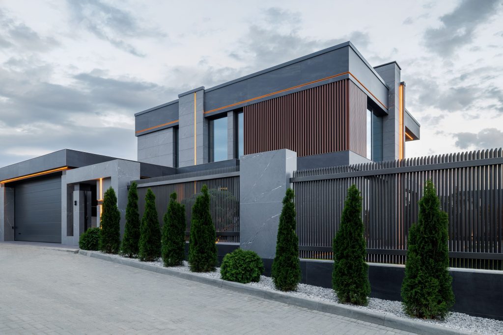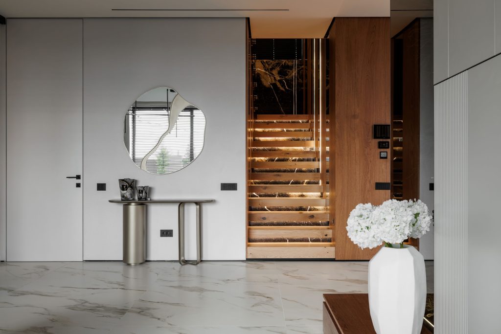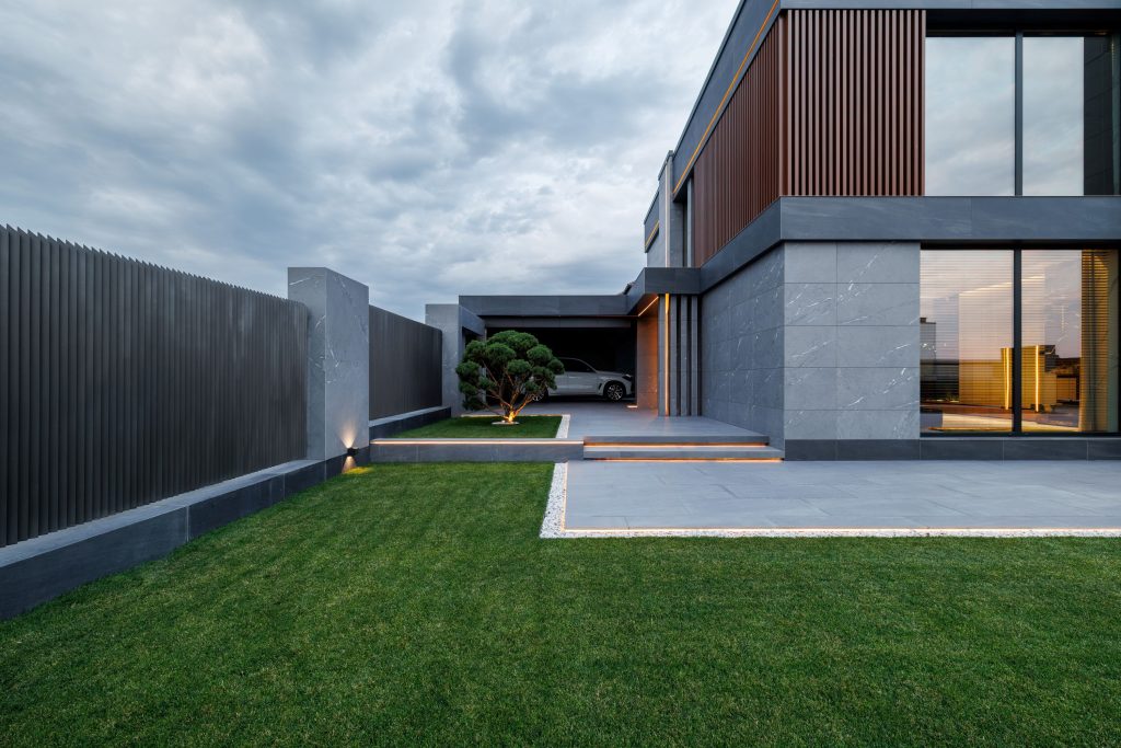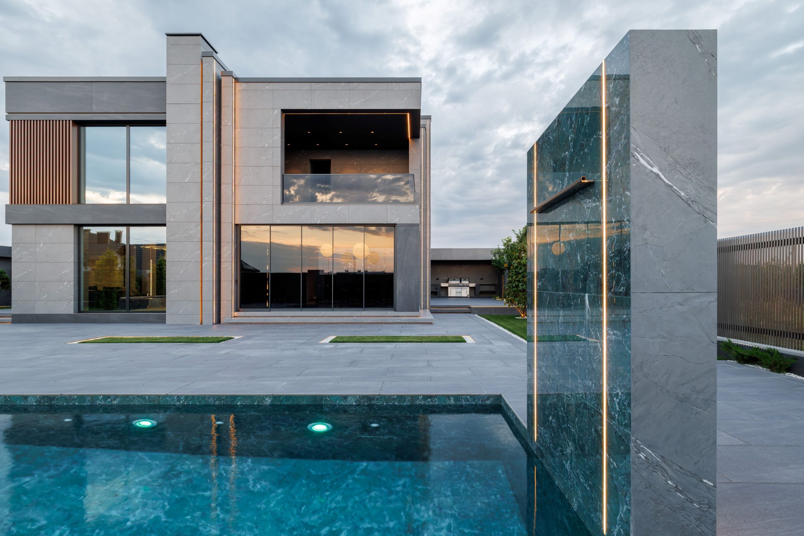 Fațada ventilată și iluminată cu LED-uri conturează identitatea arhitecturală a casei, iar în interior, materialele selectate definesc stilul: granit masiv, furnir natural, lemn prețios și tapițerii din Alcantara.