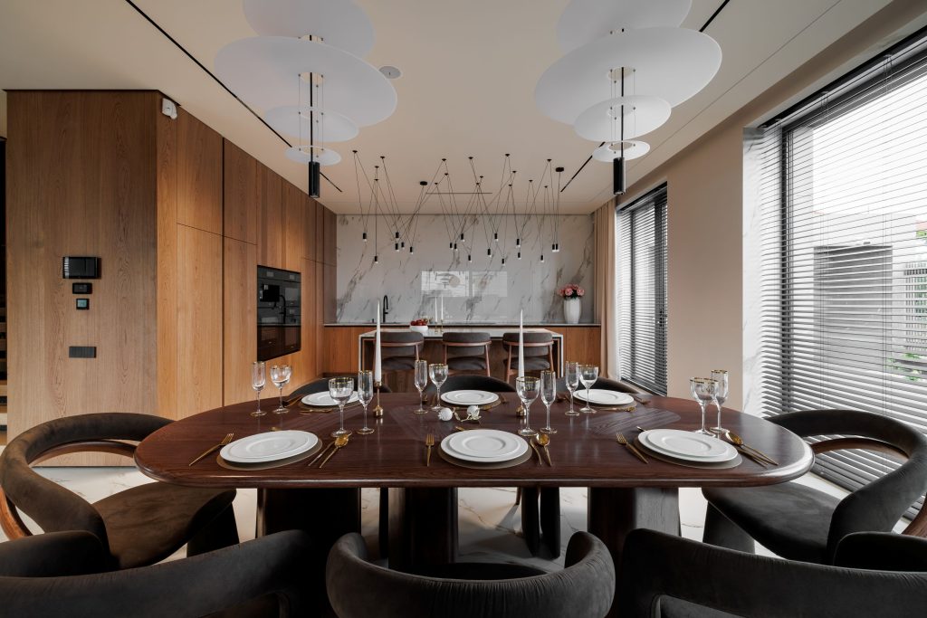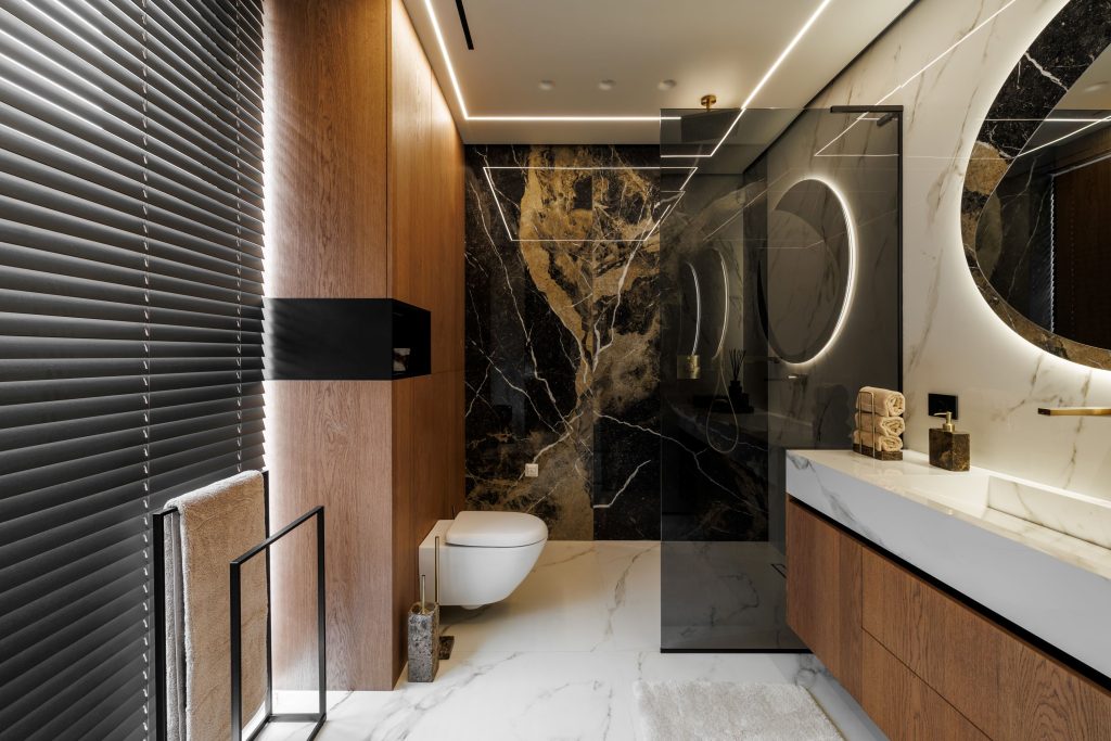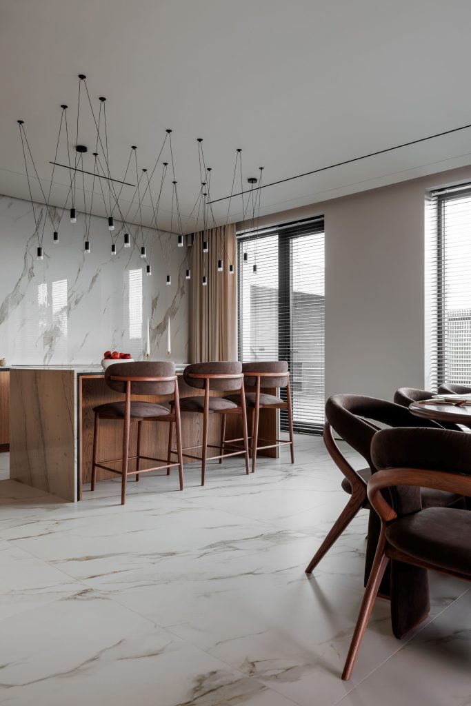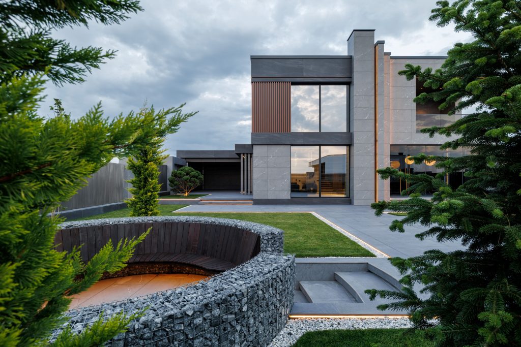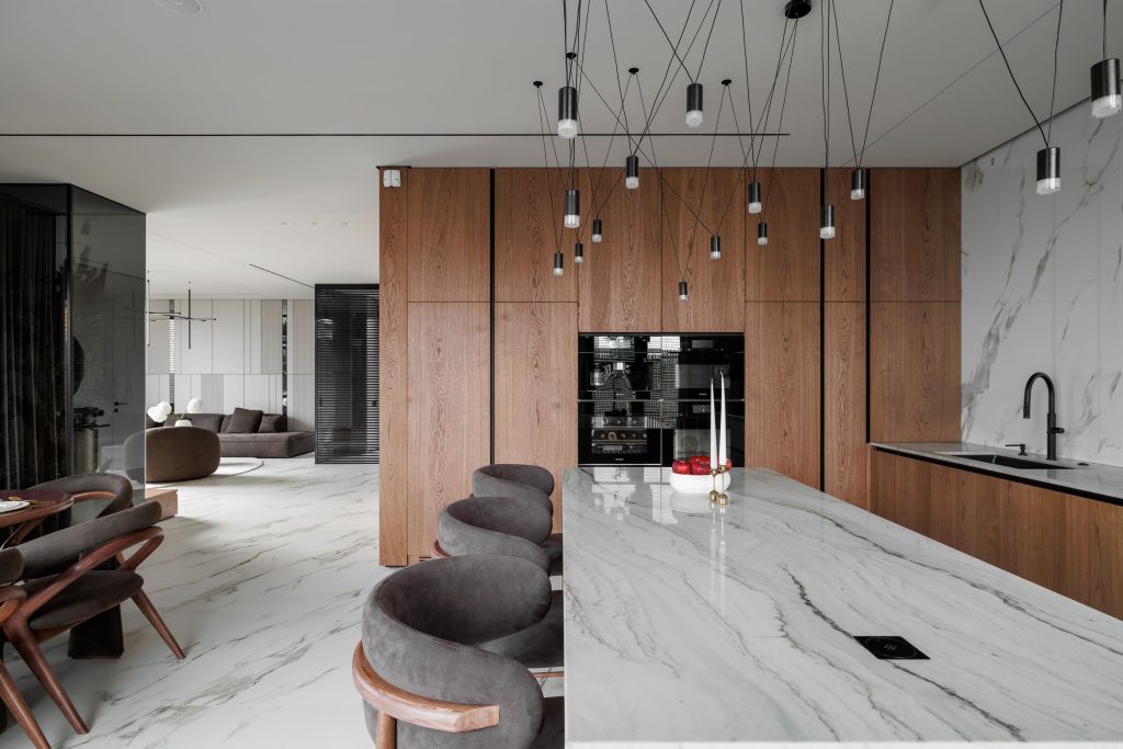 Fațada ventilată și iluminată cu LED-uri conturează identitatea arhitecturală a casei, iar în interior, materialele selectate definesc stilul: granit masiv, furnir natural, lemn prețios și tapițerii din Alcantara.