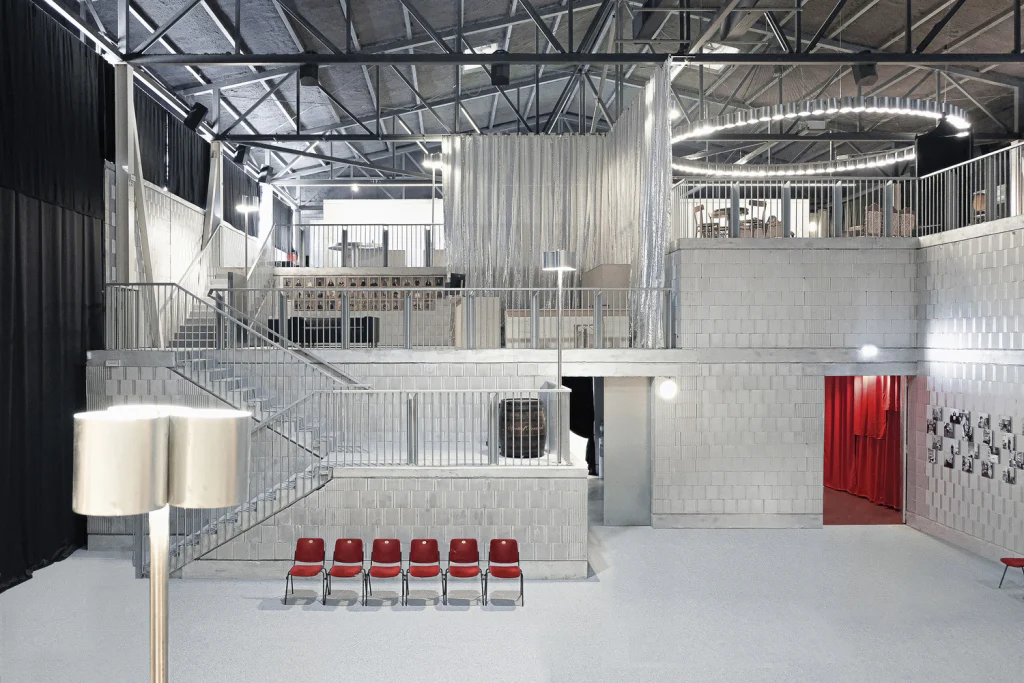 Proiectul Teatrului Național Sloven de Dramă, elaborat de Vidic Grohar Arhitekti, prezintă mai multe spații temporare, situate într-o serie de foste hale industriale din zona Litostroj din Ljubljana, Slovenia, și adaptează structurile existente într-o infrastructură culturală de teatru în timpul renovării clădirii principale. Proiectul reorganizează complexul printr-o secvență de intervenții specifice, cu buget redus, ce introduc spații de spectacol, foaiere publice și alte funcții auxiliare, păstrând în același timp logica spațială și caracterul material al sitului industrial. Noi inserții, inclusiv structuri din lemn, scaune în trepte și elemente din beton, definesc o serie de medii interconectate, printre care Marea Scenă, Teatrul Mic, săli de repetiții și un pavilion public în curte. Proiectate pentru a fi dezasamblate și reutilizate, intervențiile prioritizează metodele de construcție reversibile și materialele reciclabile, permițând complexului să funcționeze ca un cadru flexibil și adaptabil pentru scena culturală într-un context urban de tranziție.