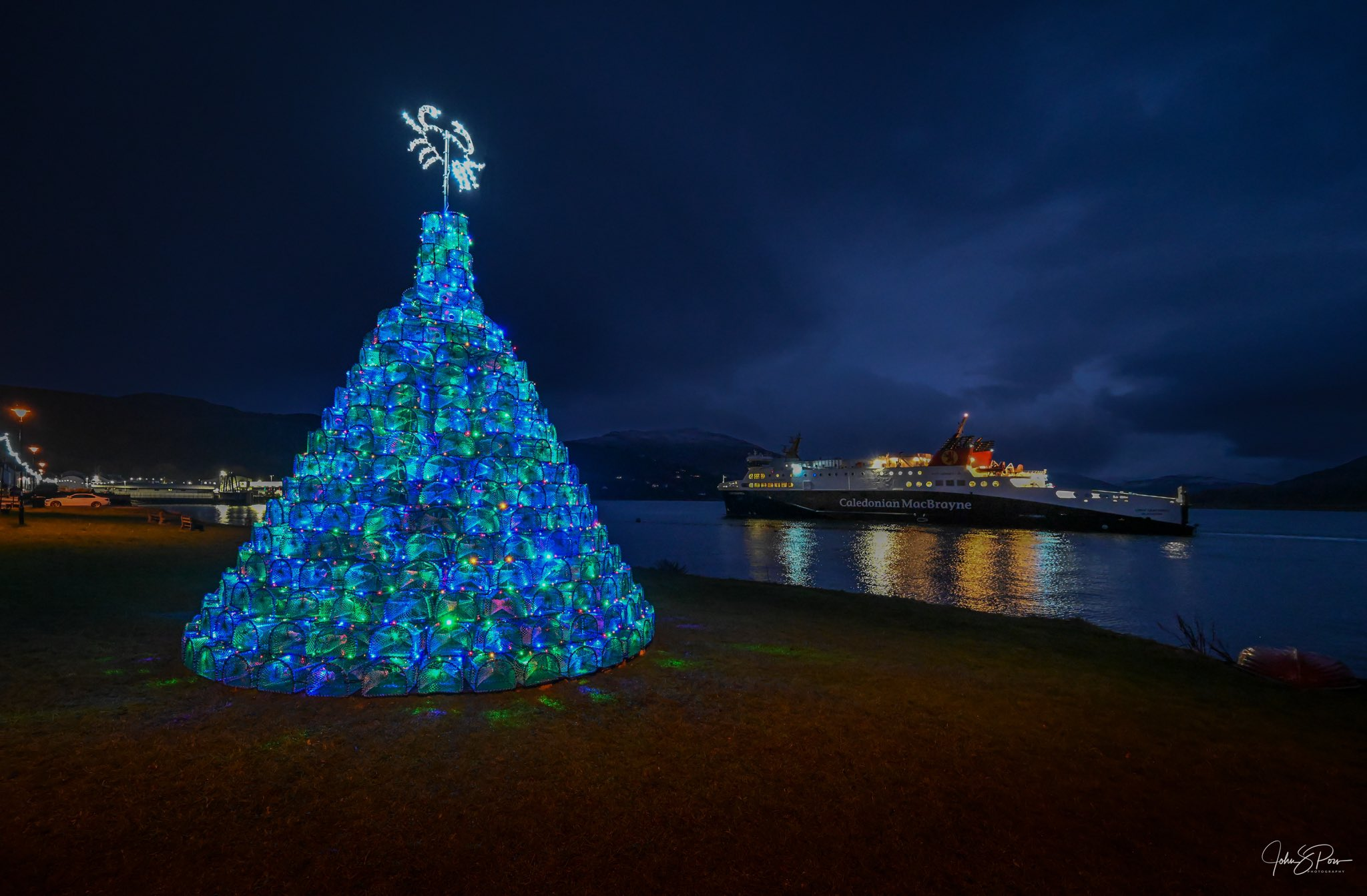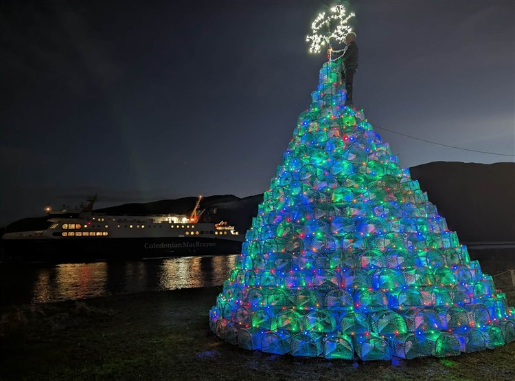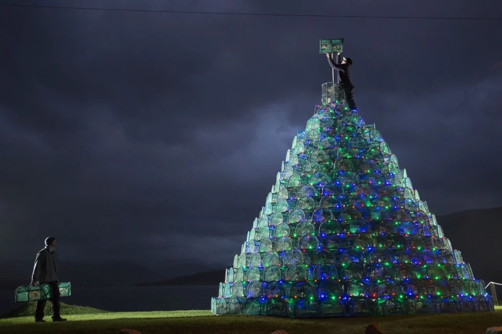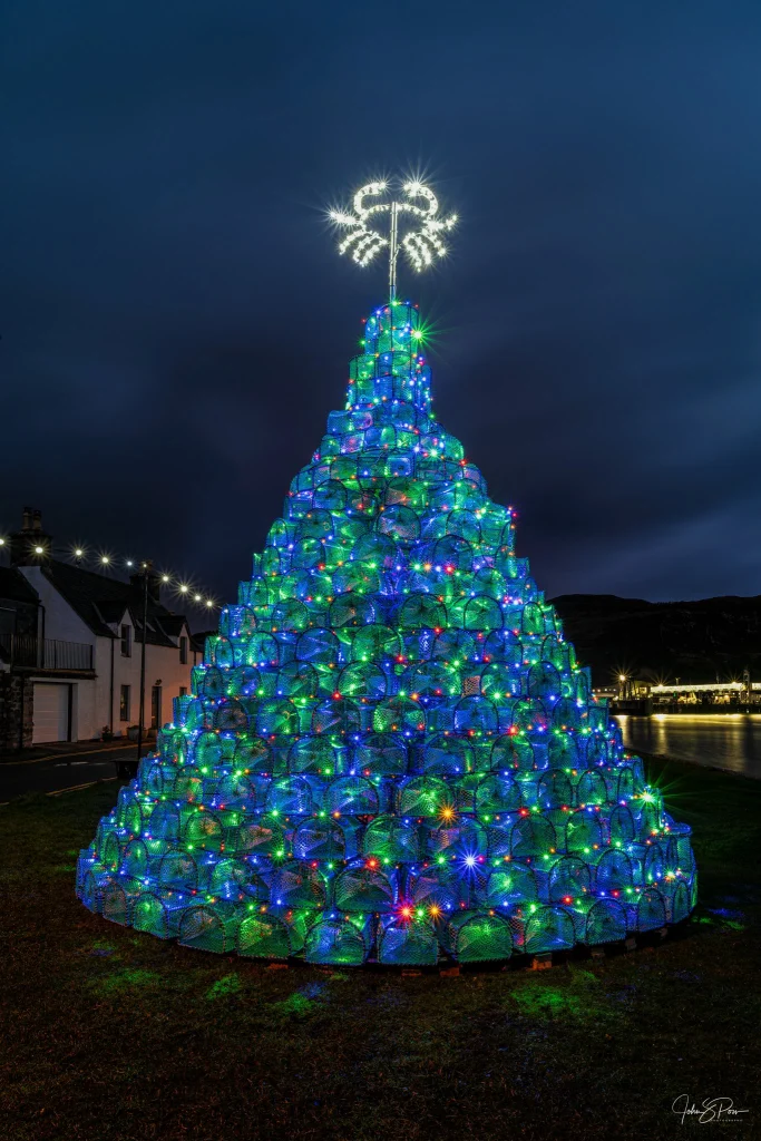 Într-un mic sat de pescari din Munții Scoției – Ullapool, locuitorii întâmpină Crăciunul construind un brad luminos din sute de coșuri de pescuit.