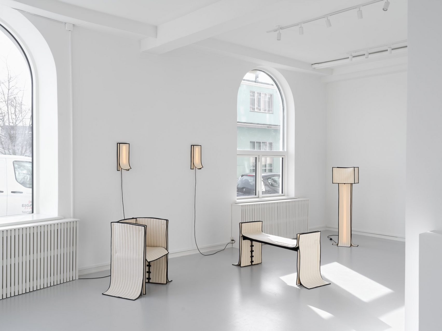 Expoziția Raiments prezintă următoarele piese: o canapea extensibilă, o serie de veioze, scaune și o bancă, toate în nuanțe liniștitoare de crem și maro-ciocolatiu.