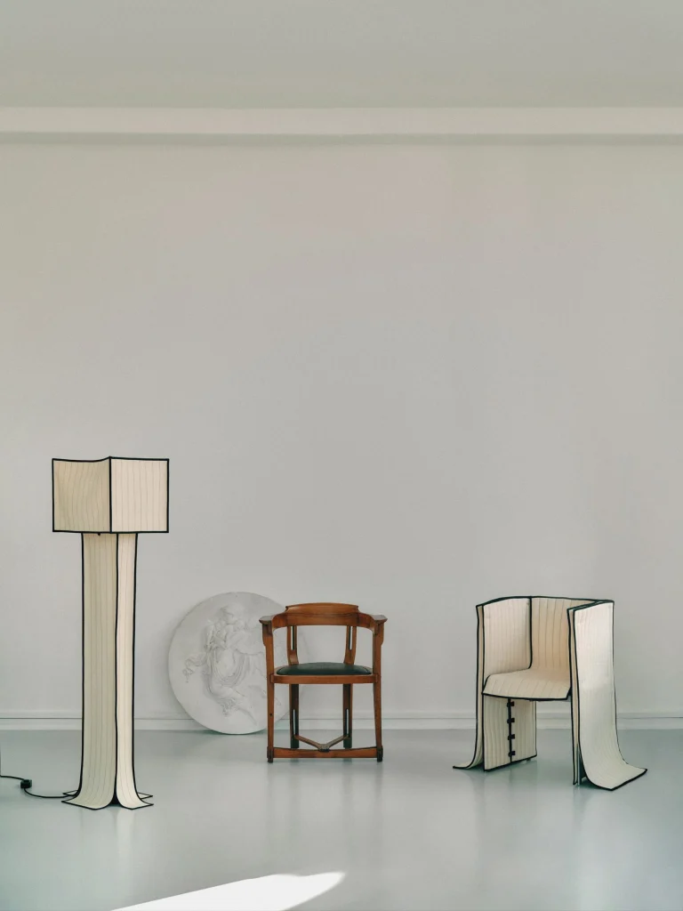 „În loc de tapițeria tradițională care se bazează pe tensiune și forță, întinzând și capsând textilele în forme rigide, piesele sunt croite ca niște haine ce se așează confortabil pe structură, permițând ca drapajul și caracterul natural al materialului să rămână vizibile”, explică autoarea.