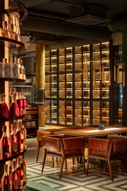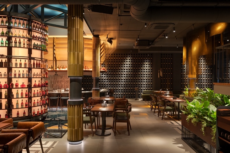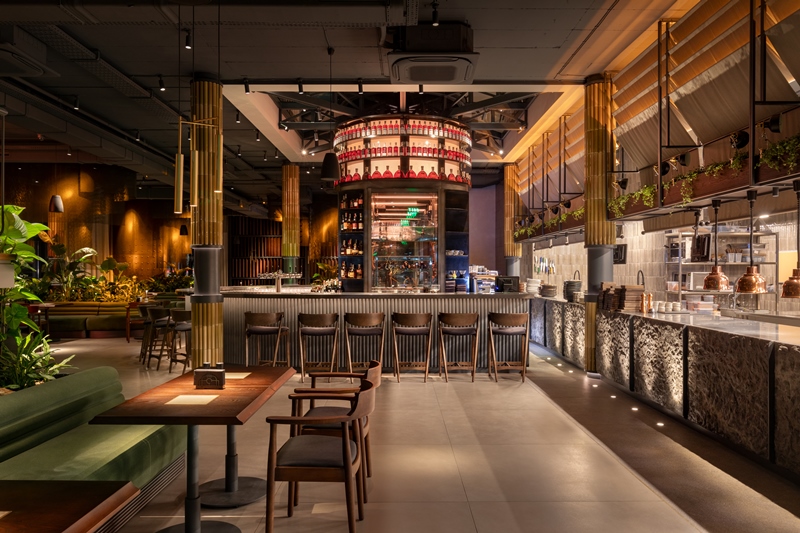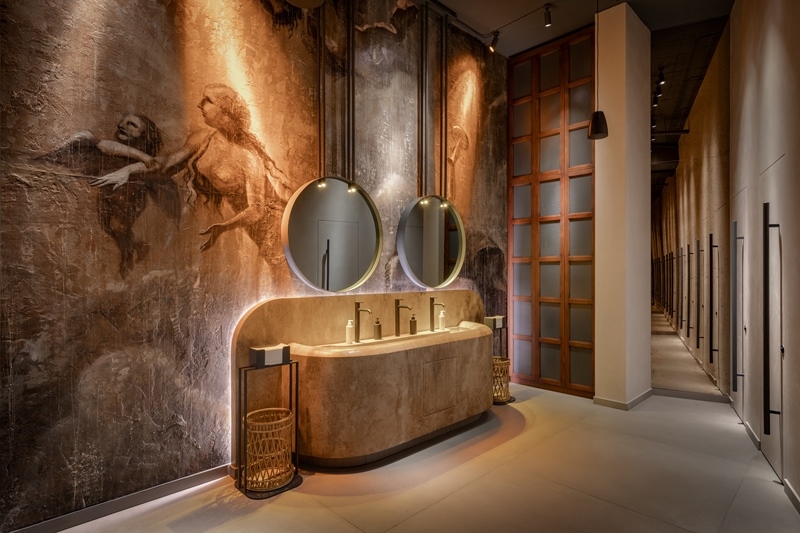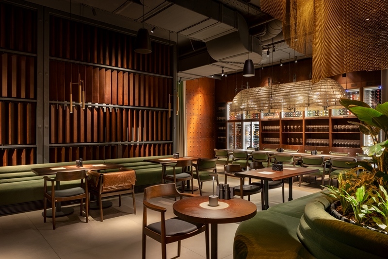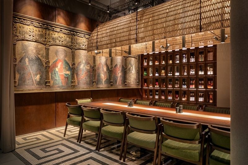 Warm sliding lights highlight copper ceiling elements, adding texture and depth to the interior’s rich materials – dark wood, metal accents, hand-painted frescoes, and live plants.