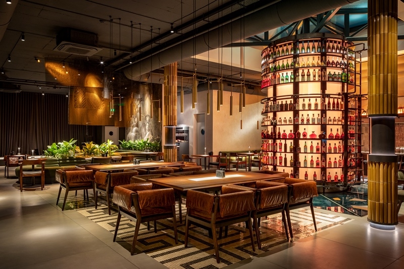 A standout feature is the towering central column with dynamic media lighting that evolves from daylight focus on elite drinks to mysterious, artful illumination by night.