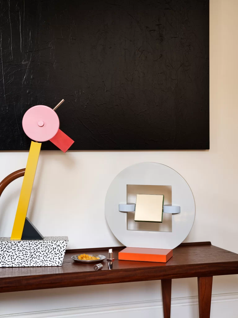 Lampa Tahiti de Ettore Sottsass și oglinda Ionian de Michele De Lucchi creează un joc subtil de lumini și reflexii. Tahiti are un stil clasic, în timp ce oglinda Ionian este o bijuterie ce se cere descoperită. Astfel, Memphis transformă aspecte cotidiene într-o experiență vizuală bogată în eleganță și fantezie, prin forme și culori.