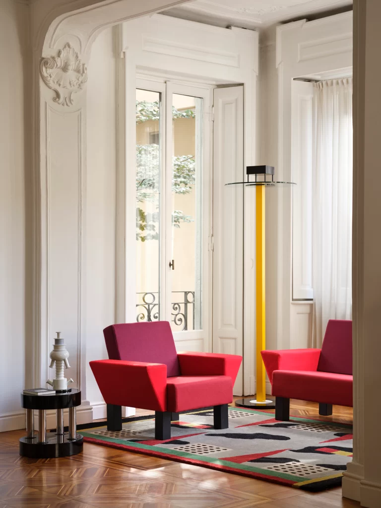 Acest apartament clasic, burghez, din inima orașului Milano, a fost transformat datorită designului inconfundabil a Memphis Group*. Canapeaua și fotoliul Westside sunt protagonistele spațiului de living prin culorile îndrăznețe și formele unice. Acestea au fost proiectate de renumitul Ettore Sottsass. Spațiul este completat de măsuța Hyatt, proiectată de același maestru pentru propria sa casă din Milano.