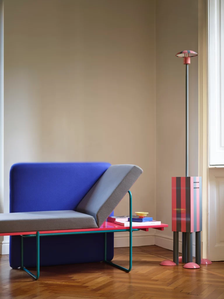 Century de Andrea Branzi reimaginează noțiunea de confort: precizia și contrastele vii creează un spațiu pentru intimitate și relaxare. Lampa de podea Terminus, proiectată de Martine Bedin, veghează ca un totem, sculpturală și luminoasă.