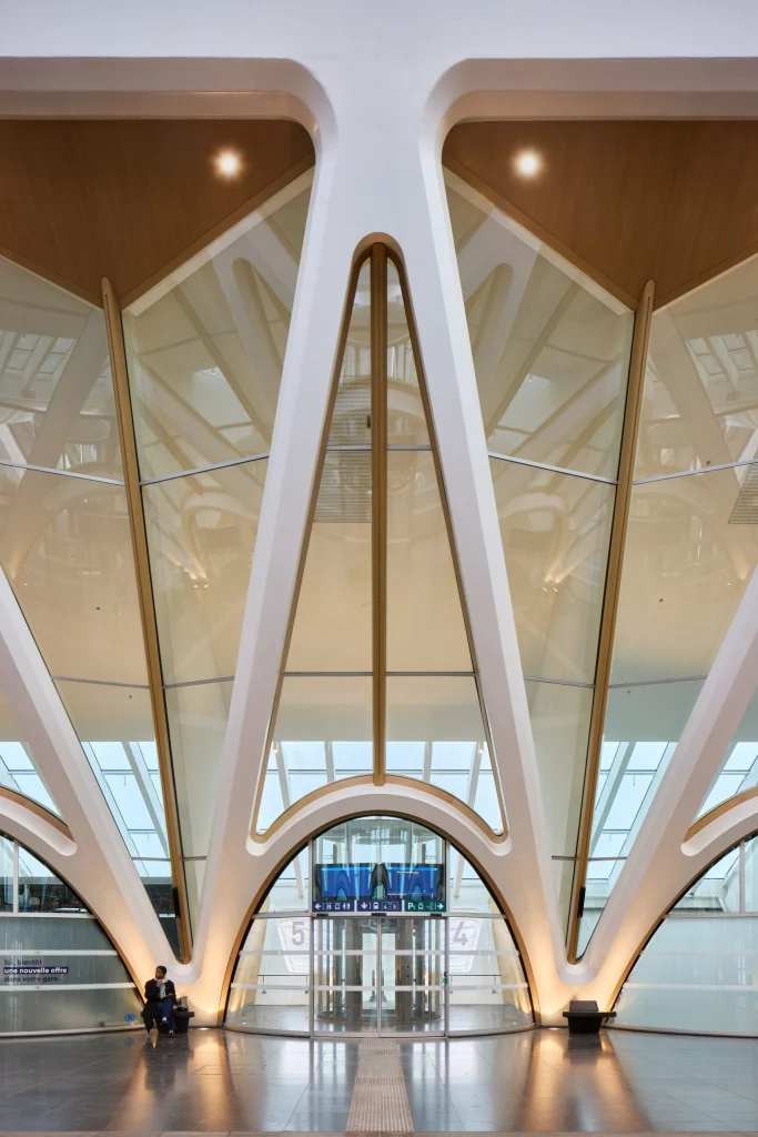 În interiorul gării, structura triunghiulară de bază este expusă, cu intrări curbate din sticlă către peroane, magazine și alte facilități conturate de curbele structurale.