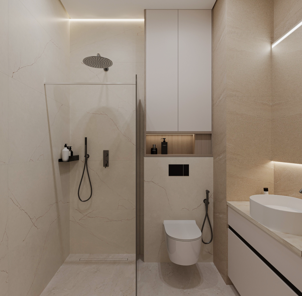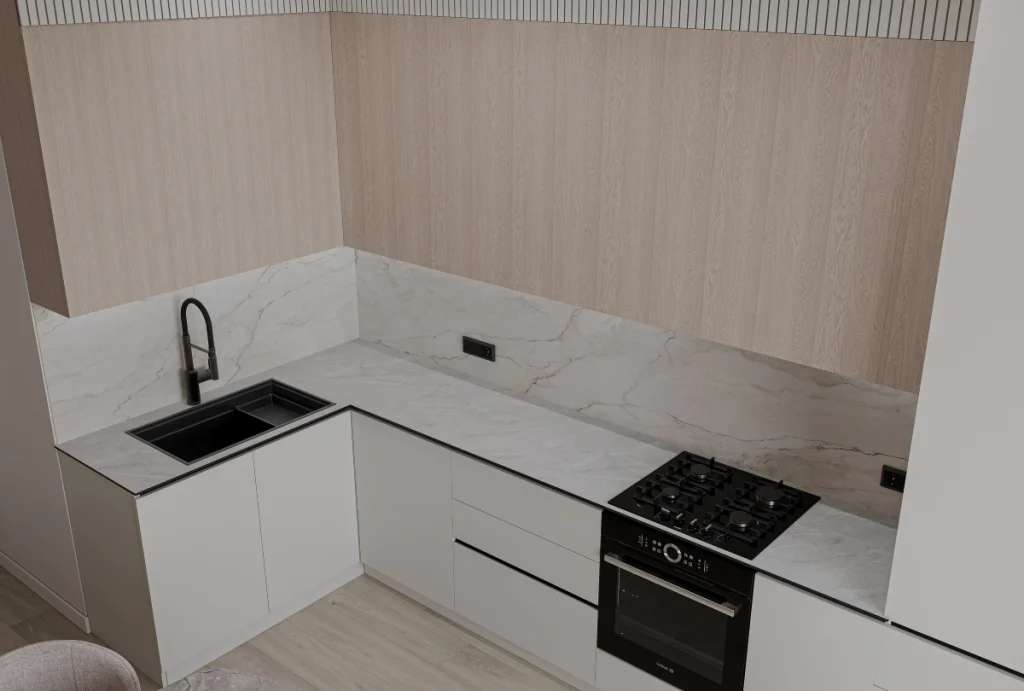 Zona comună de living, bucătăria, dormitoarele și baia au un limbaj stilistic comun ce creează, în ansamblu, un design interior modern și echilibrat.