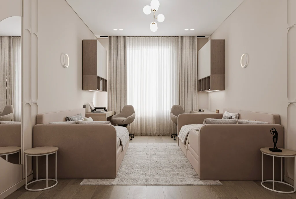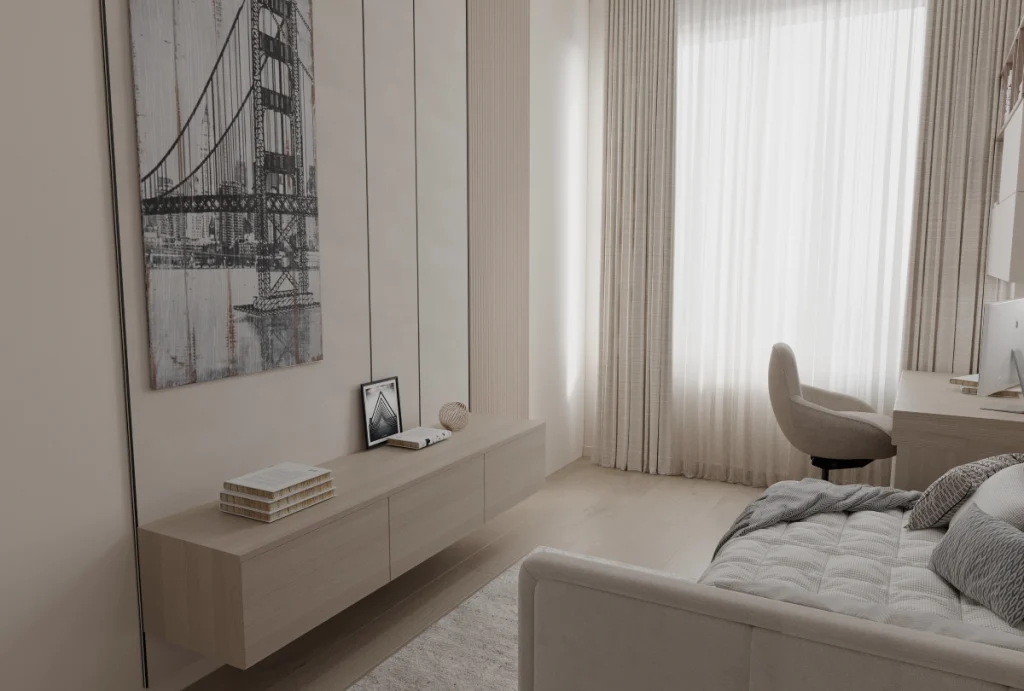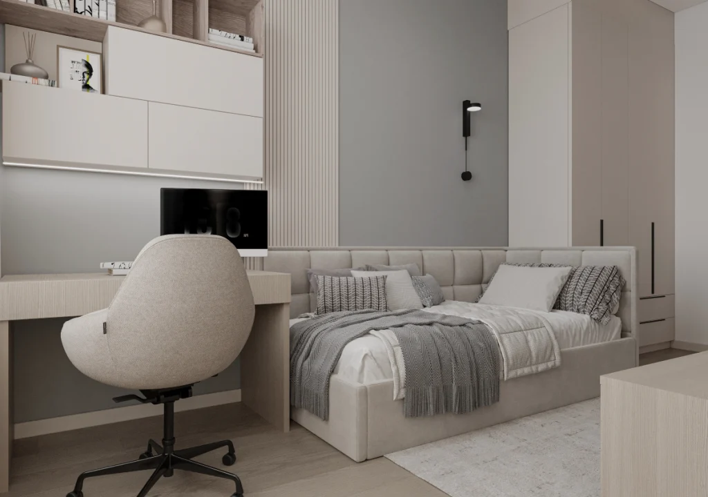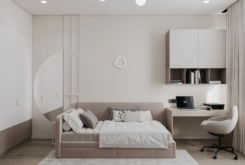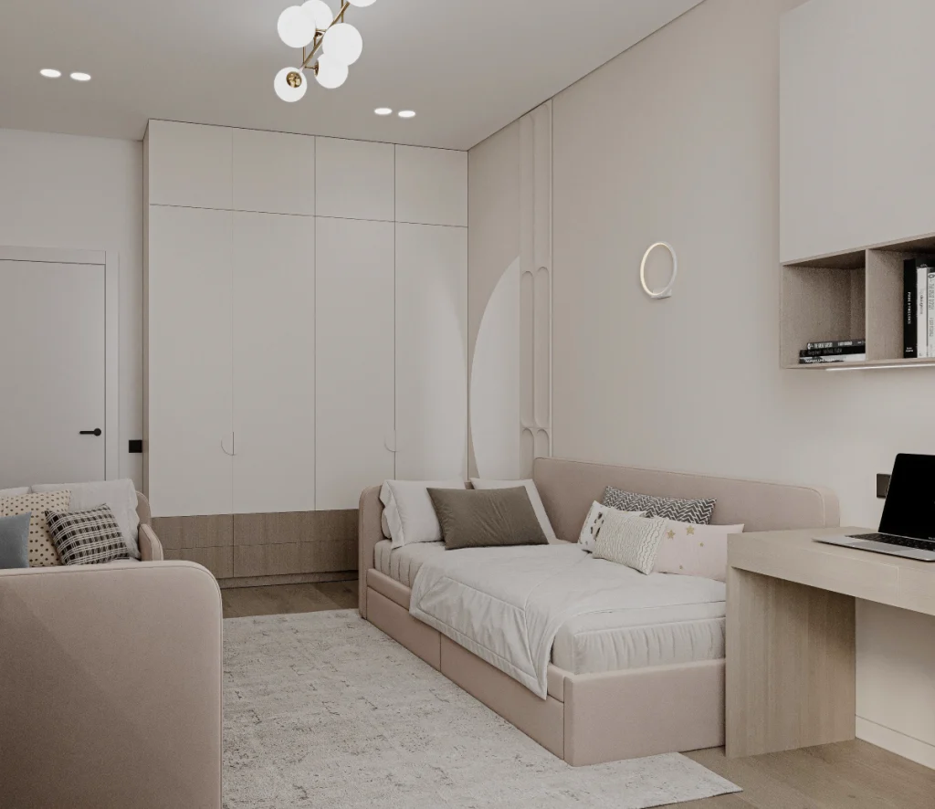 Paleta de culori folosește tonuri deschise, cu accente subtile contrastante ce înviorează vizual spațiul.