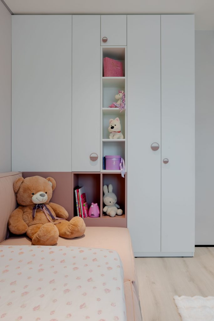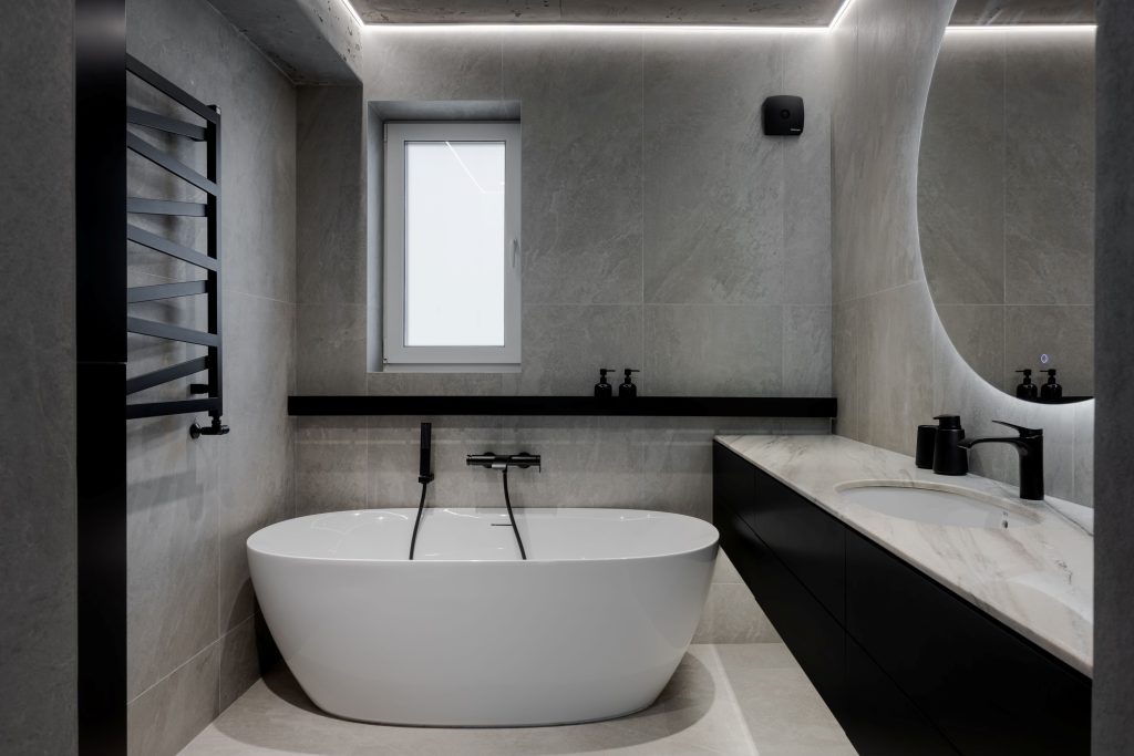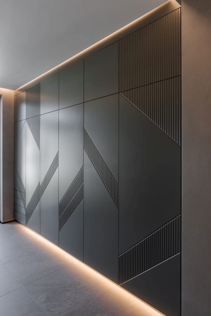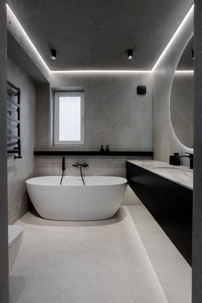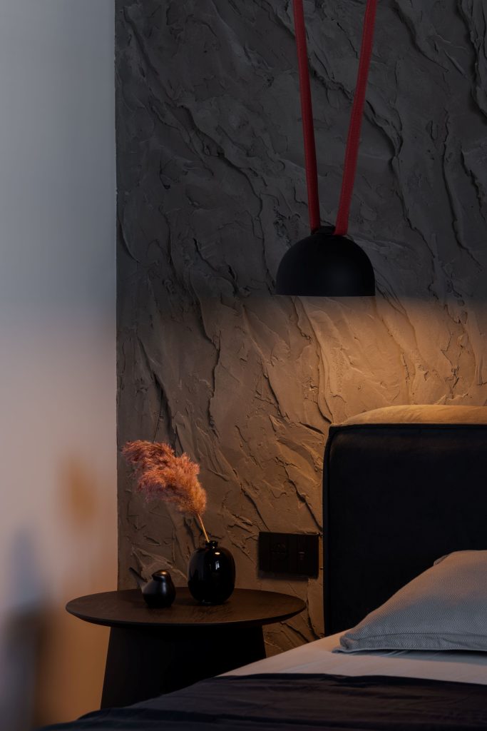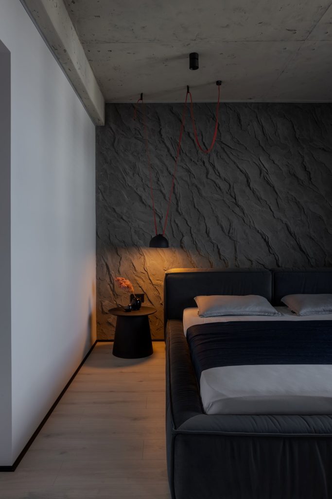 Dormitorul are un aspect teatral datorită texturii reliefate a pereților, iar baia contrastează ușor printr-o atmosferă relaxantă, prezentând o cadă sculpturală și finisaje elegante.