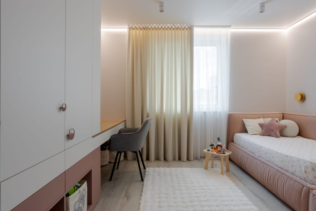 Aspectul spațios este accentuat prin liniile clare și mobilierul minimalist.