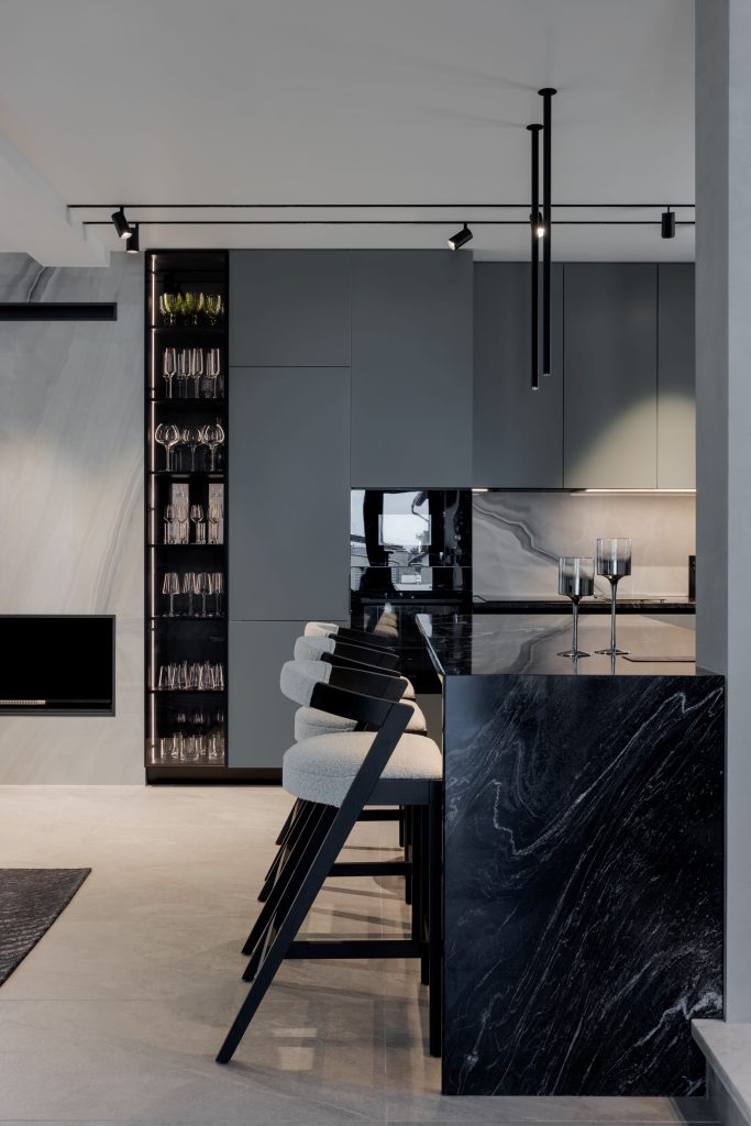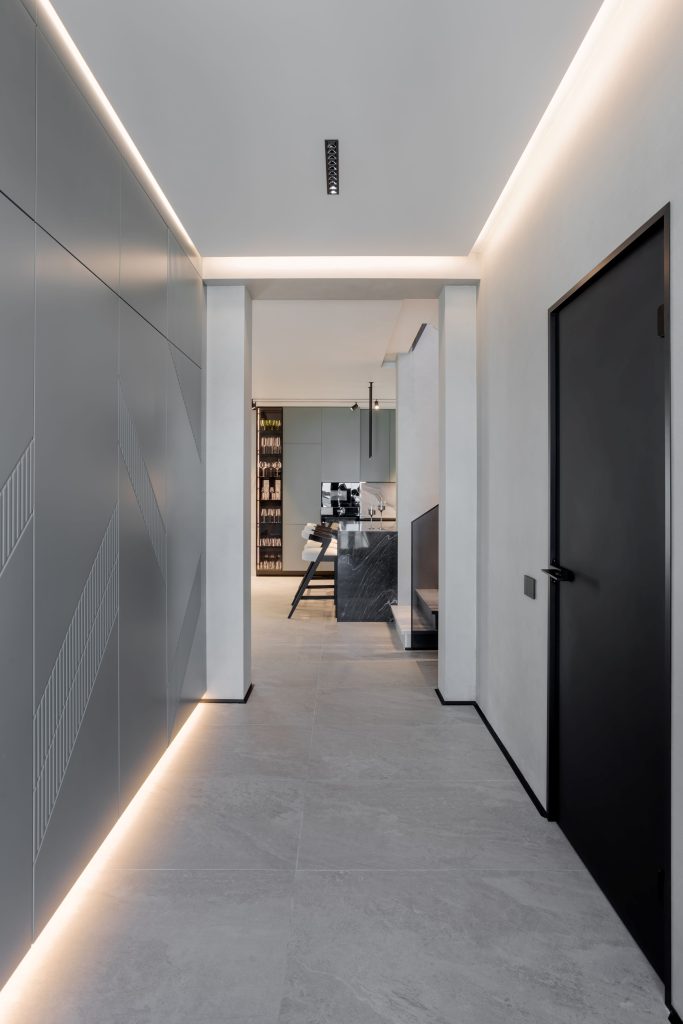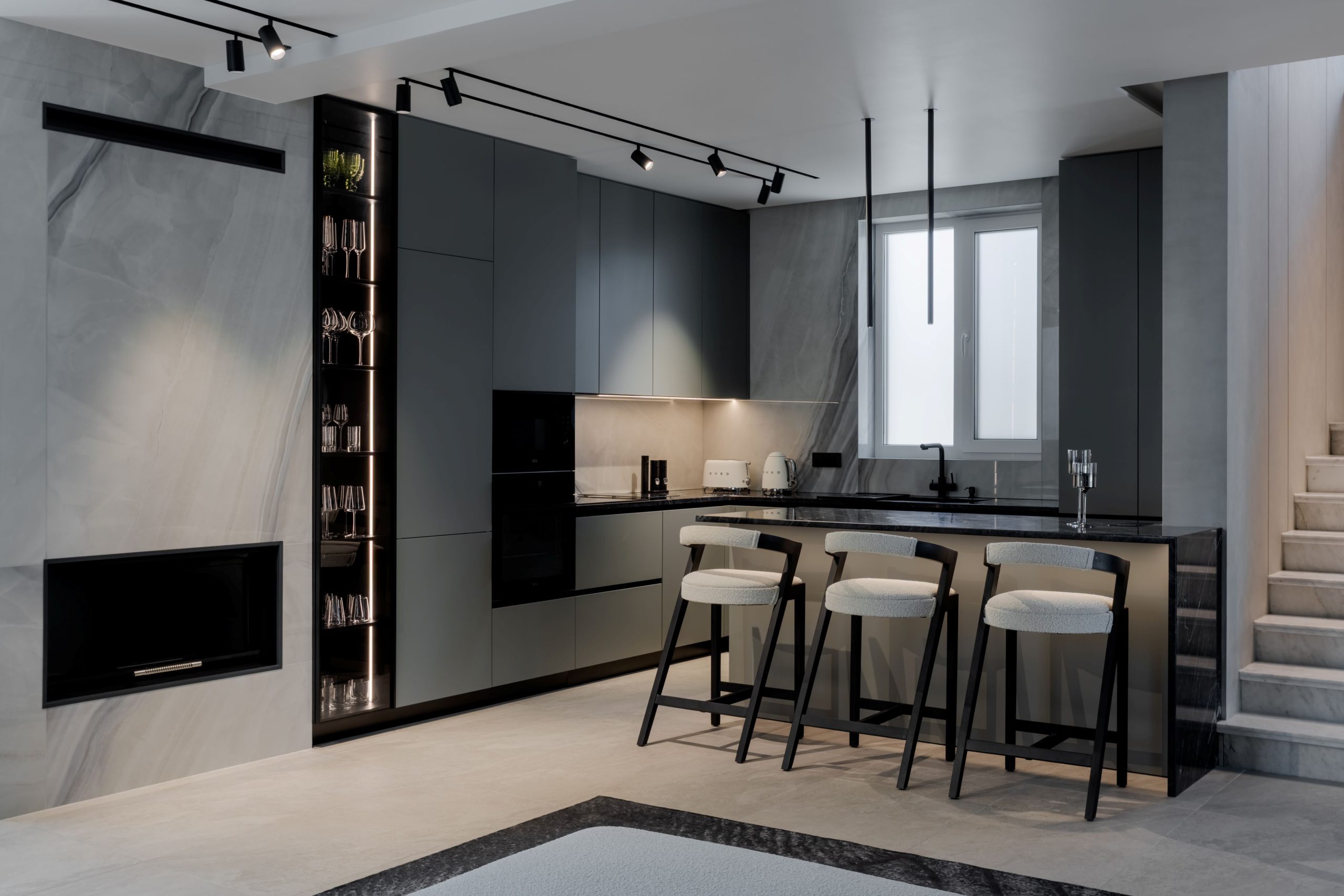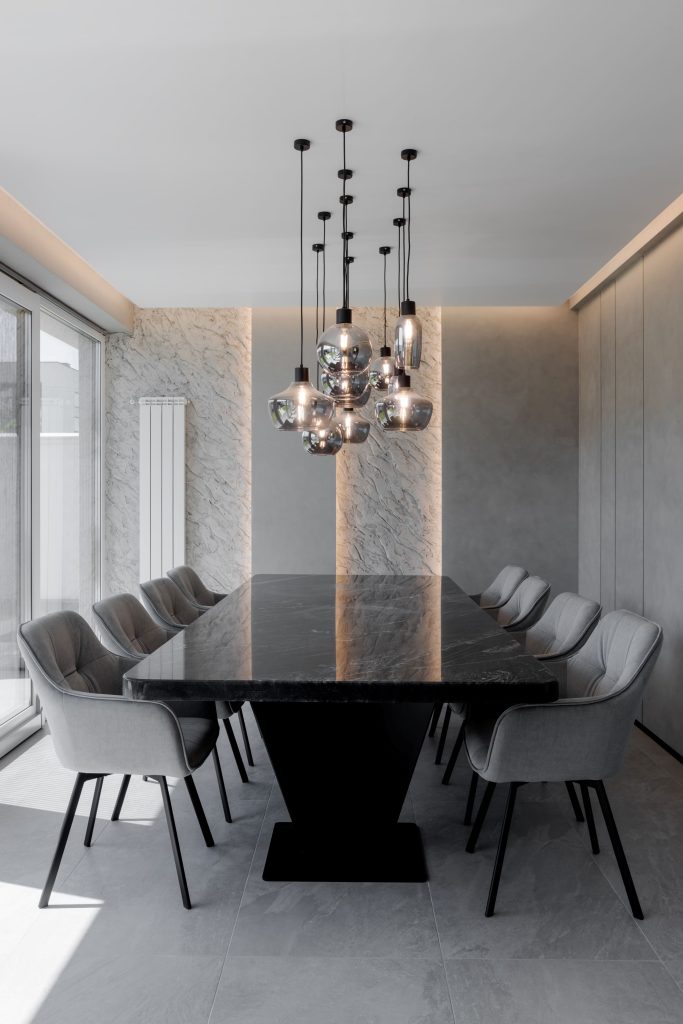 Lumina este un element de design în sine – benzi LED discrete, spoturi pe șine negre, corpuri minimaliste suspendate, ce trasează geometrii subtile și scot în evidență volumele arhitecturale.