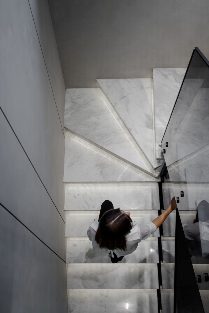 Paleta cromatică este una neutră: tonuri de gri, alb, bej și negru, fapt ce creează o atmosferă calmă, subliniată inclusiv de texturile naturale: piatră, beton aparent și finisaje minerale.