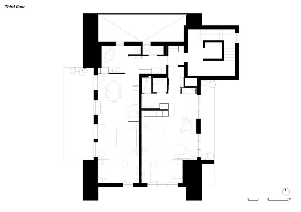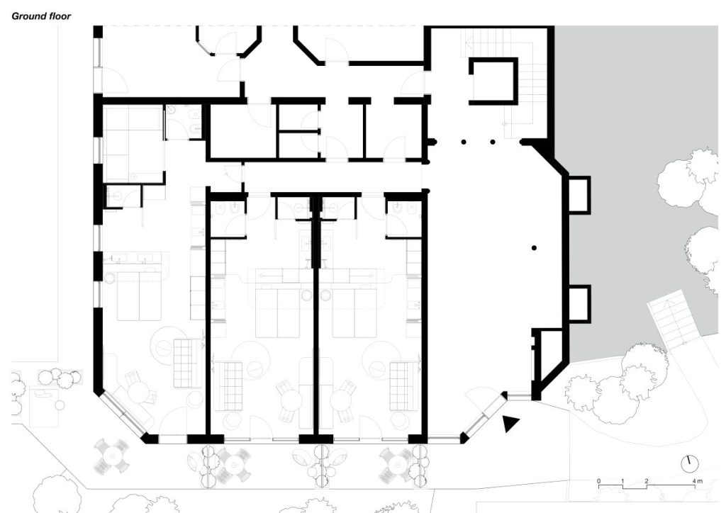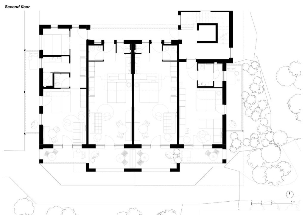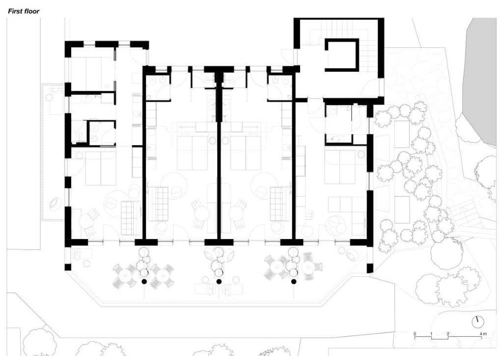 Această proprietate largă a familiei Obkircher este formată din trei clădiri: casa principală, o construcție anexă cu apartamente și o zonă de wellness. Proiectul s-a concentrat pe renovarea celor 13 apartamente din clădirea anexă. Scopul a fost modernizarea interioarelor și regândirea radicală a amenajării acestora, deschizând zona centrală pentru lumina naturală a soarelui și renunțând la separarea tradițională dintre baie, dormitor și living.