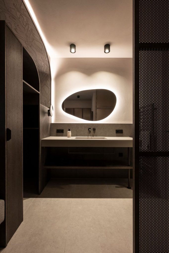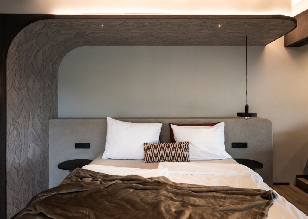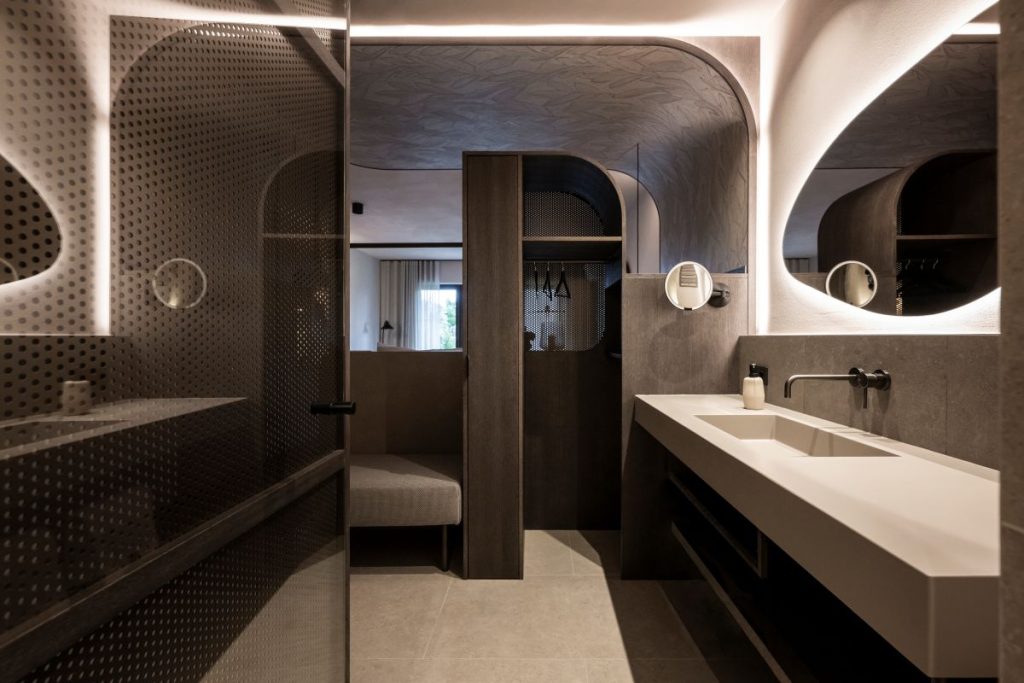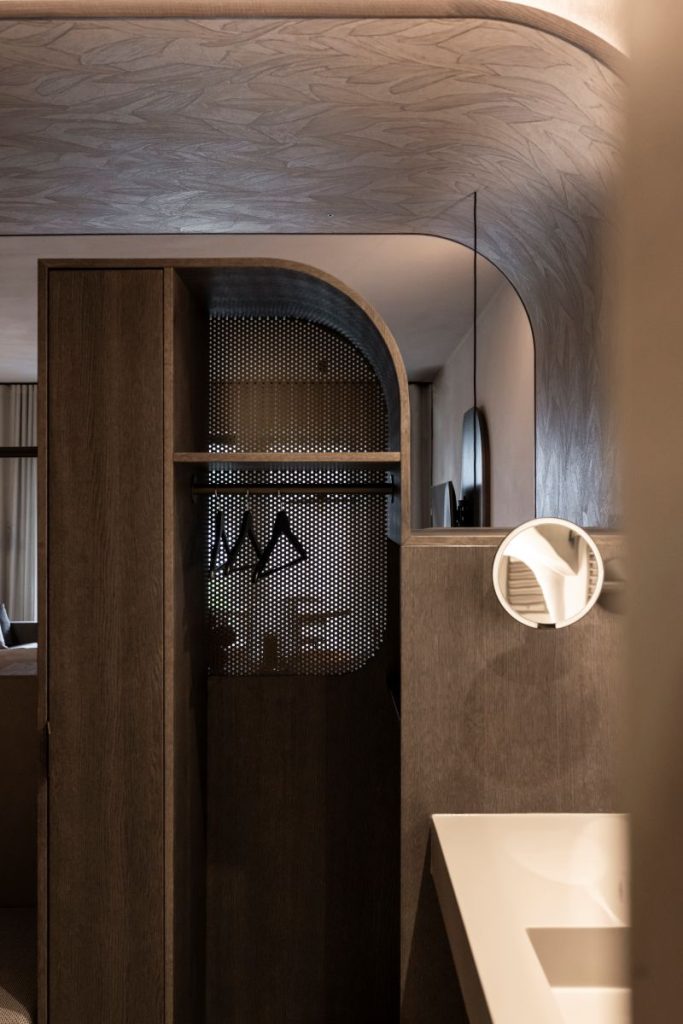 „Nu am abordat proiectul din perspectiva amenajărilor standard ale mobilierului, ci prin ideea ca fiecare cameră să devină o zonă privată de wellness pentru oaspeți”, explică Christian Rottensteiner, partener NOA și arhitect principal al proiectului. „Fiind un proiect pentru oaspeți, am divizat interioarele camerelor într-un mod provocator și neobișnuit: mobilierul este un tot întreg, un continuu fluid, prin care granițele dintre baie și dormitor se dizolvă.”