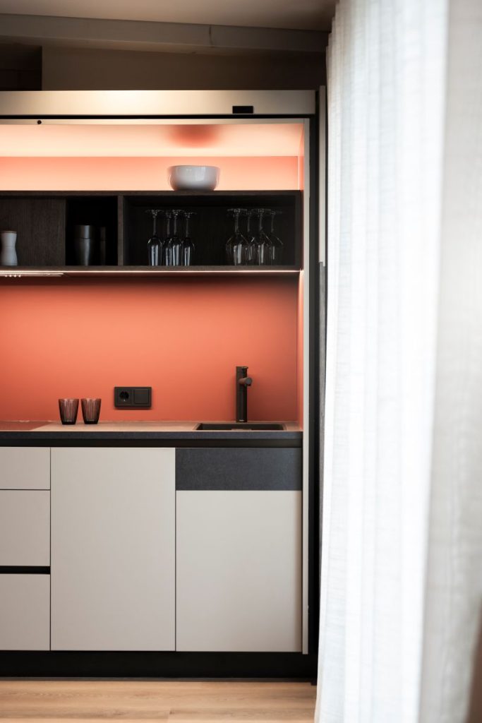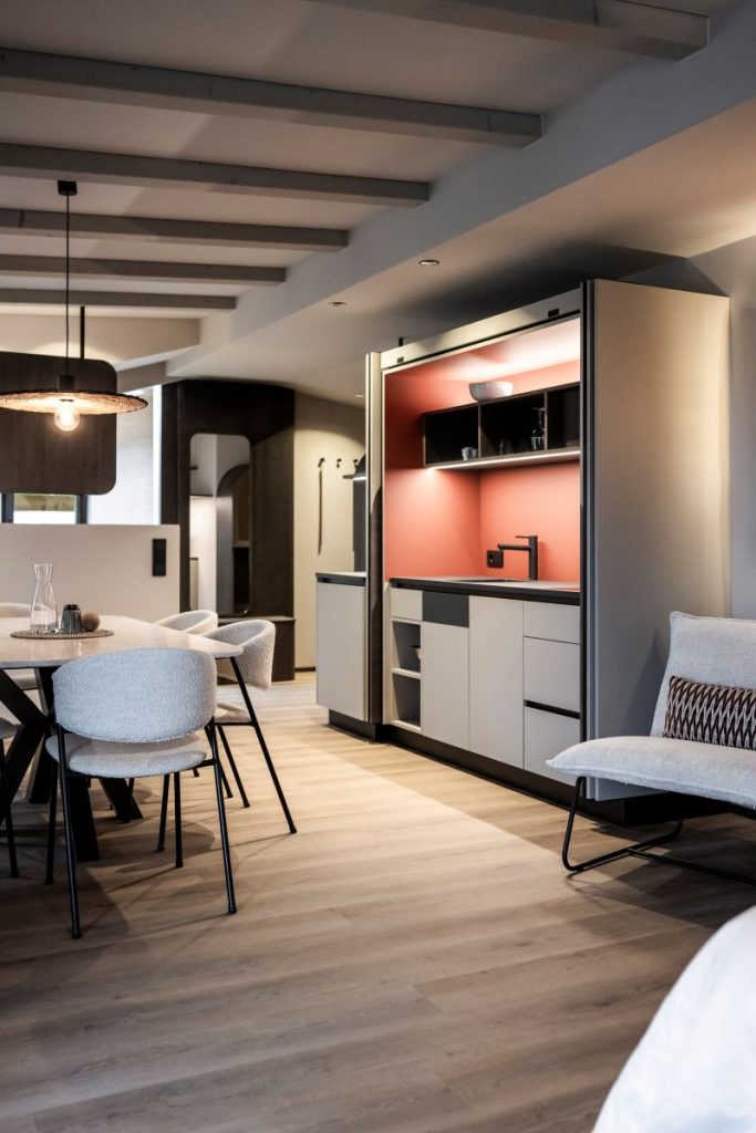 Conceptul tradițional de cameră a fost lărgit: un modul de bucătărie, complet echipat, este integrat într-o piesă de mobilier specială, care poate fi deschisă sau închisă după necesități. Totodată, noile amenajări păstrează lumina naturală și permite, astfel, folosirea spațiilor la maxim.