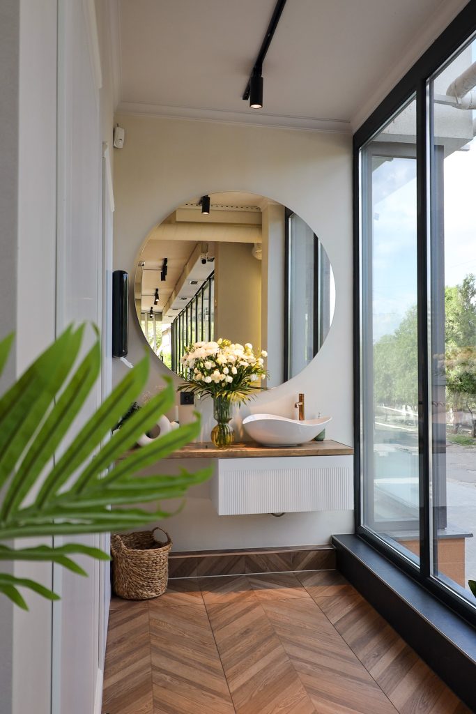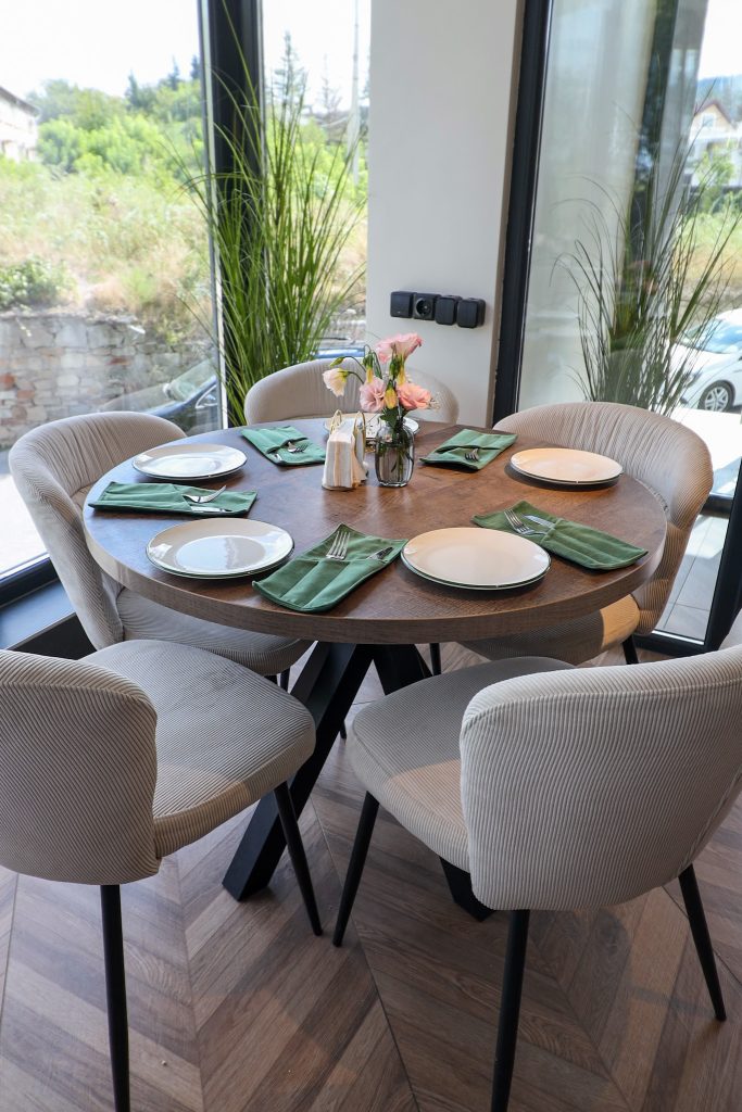 Paleta de culori este deschisă, dar cu accente de tonuri naturale: maro, verde, negru, care conferă echilibru și naturalețe interiorului.