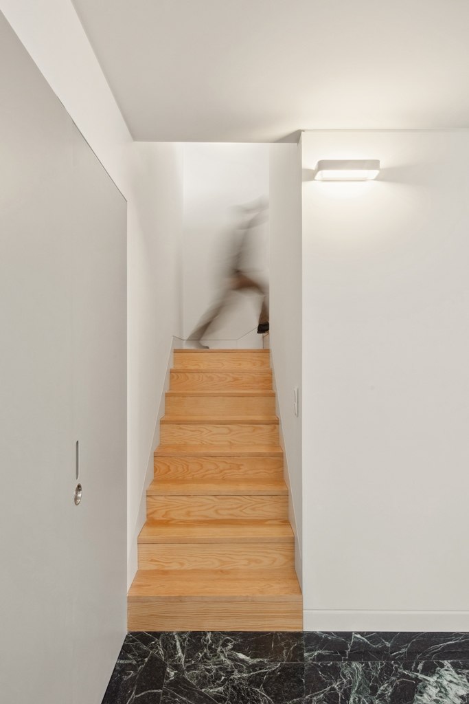 În interior, designul de iluminat, într-un stil ușor scenografic, marchează circulația în spațiu. Zonele sociale sunt orientate spre sud, deschizându-se spre stradă și beneficiind de lumină naturală filtrată prin lamelele din lemn.