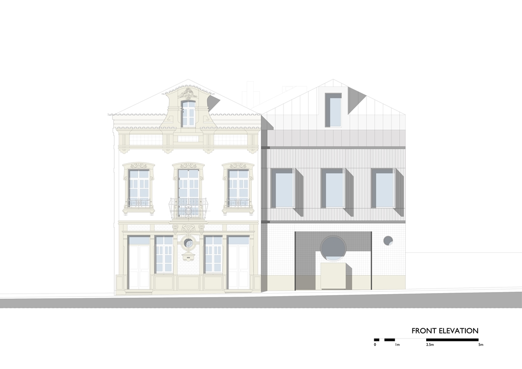 De asemenea, proiectul păstrează structura tipică de două etaje, trei travee și o fereastră centrală la nivelul mansardei, o terasă superioară în zona din spate – o abordare firească și des întâlnită în tot orașul. Proiectul subliniază moștenirea preexistentă fără a căuta să o eclipseze.