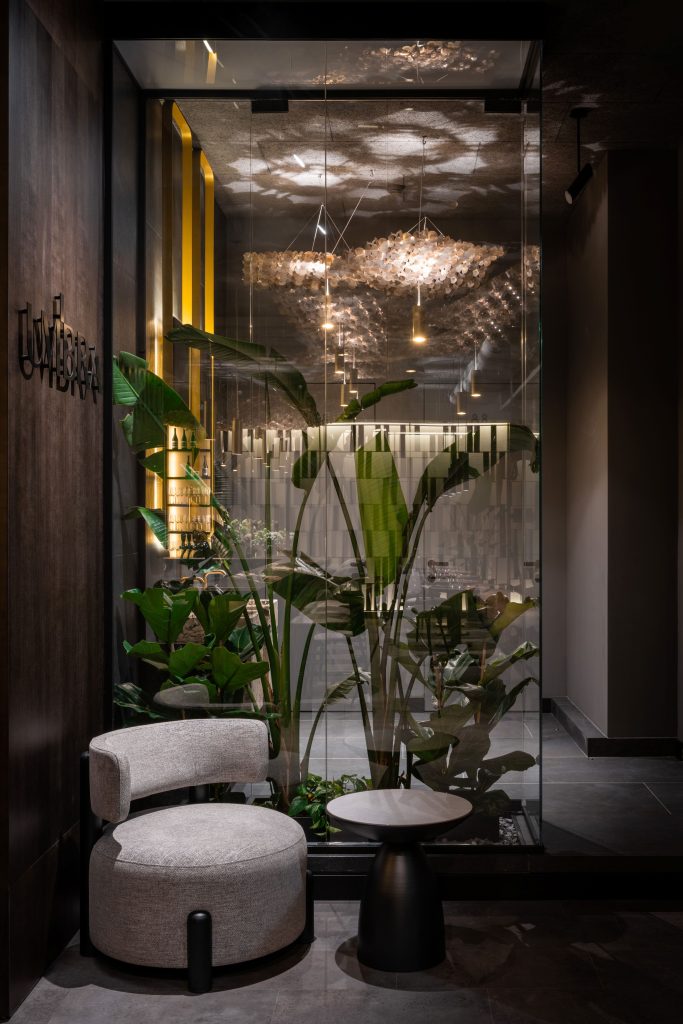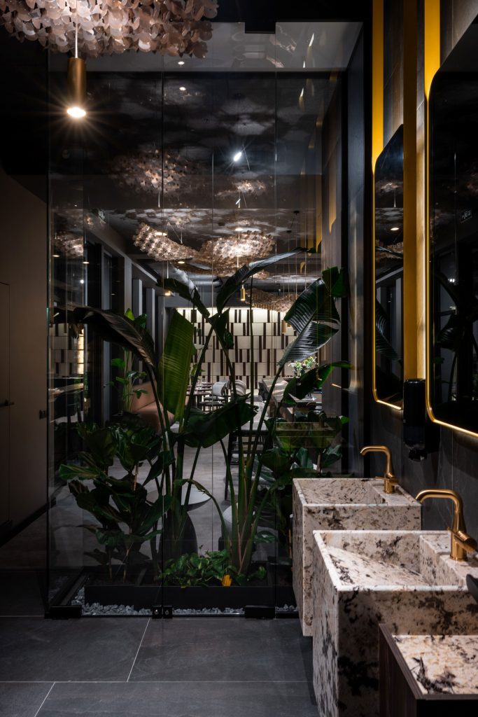 Fiind un spațiu limitat datorită amplasării la demisol, designul explorează moduri alternative de a introduce și amplifica lumina: light boxuri integrate în mobilierul de bar, oglinzi mari, corpuri suspendate cu iluminare direcționată, accente de benzi LED ascunse și instalații aurii suspendate de tavan, ce difuzează lumina fragmentat și maschează rețelele inginerești.