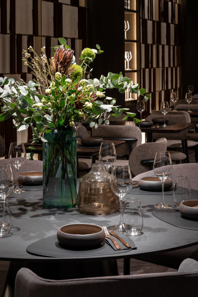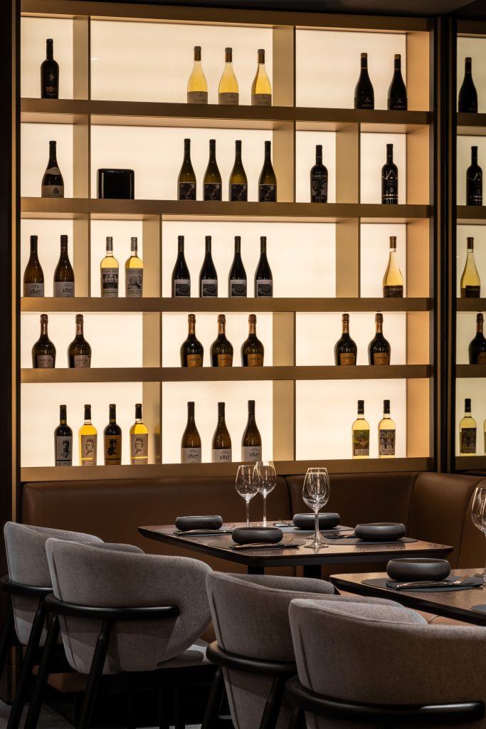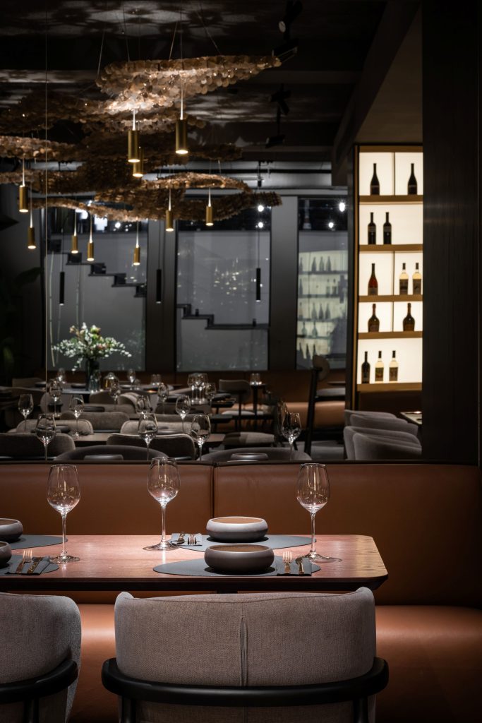 Inserțiile din piele naturală aplicate pe structurile metalice verticale ale pereților formează o textură tridimensională care, detașându-se ușor de fundal, lasă umbre fine – un gest subtil, dar clar, către tema identitară a spațiului.